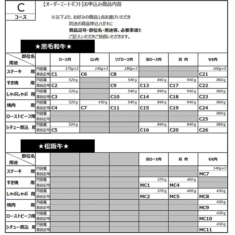 下記のうち用途にあわせた部位・カッティングをお選びいただけるパンフレットとお申込みハガキをお届けします。