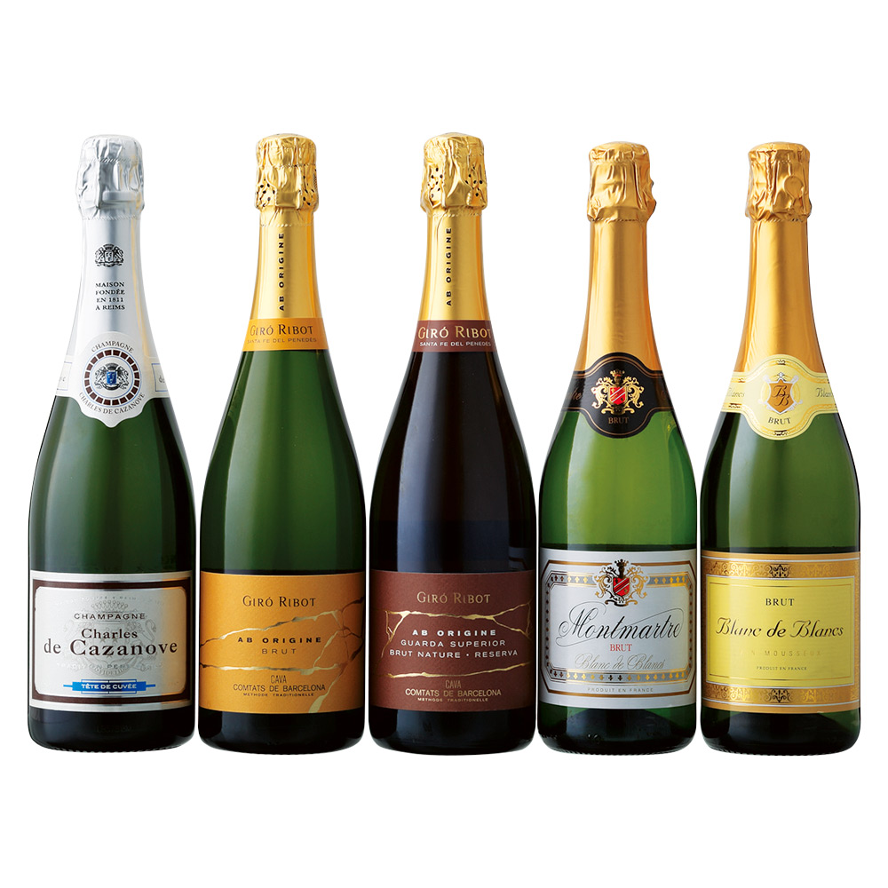 シャルル・ド・カザノーヴ・ブリュット、ジロリボ・エービーオリジン(ブリュット、ブリュット・ナチュレ・レセルバ)、モンマルトル・ブリュット、ブラン・ド・ブラン・ブリュット 各750ml