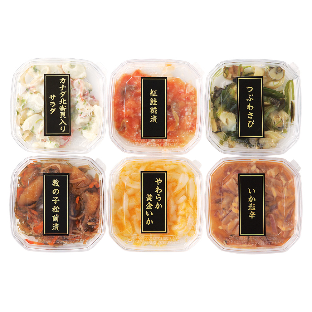 いか塩辛・紅鮭糀漬・やわらかいか黄金・カナダ北寄貝入りサラダ・数の子松前漬・つぶわさび各60g ※12月28日→30日のお届け(承り期間:12月15日まで)