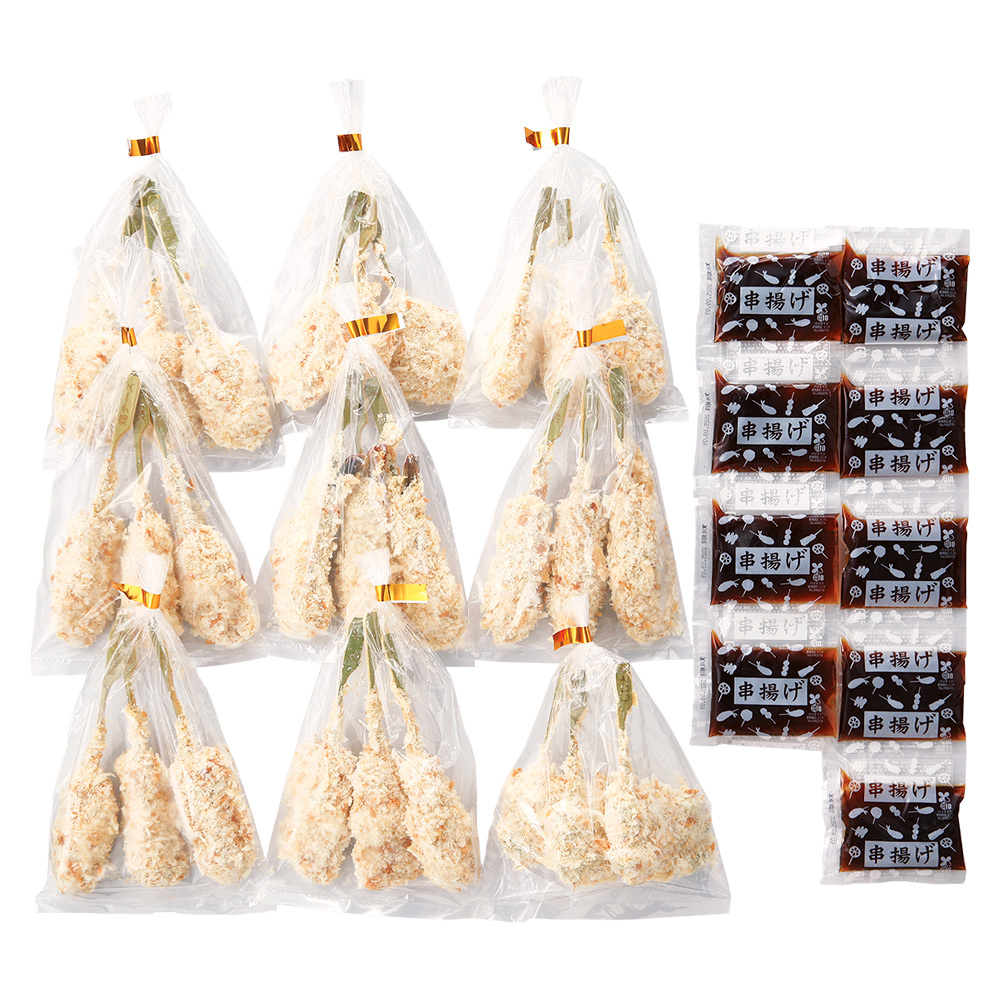 豚ヒレ・海老・ポークウィンナー・鶏ねぎ・ほたて・ししとう・甘鯛・鶏チーズ・豚ロースチーズ 各3計27本、ソース付