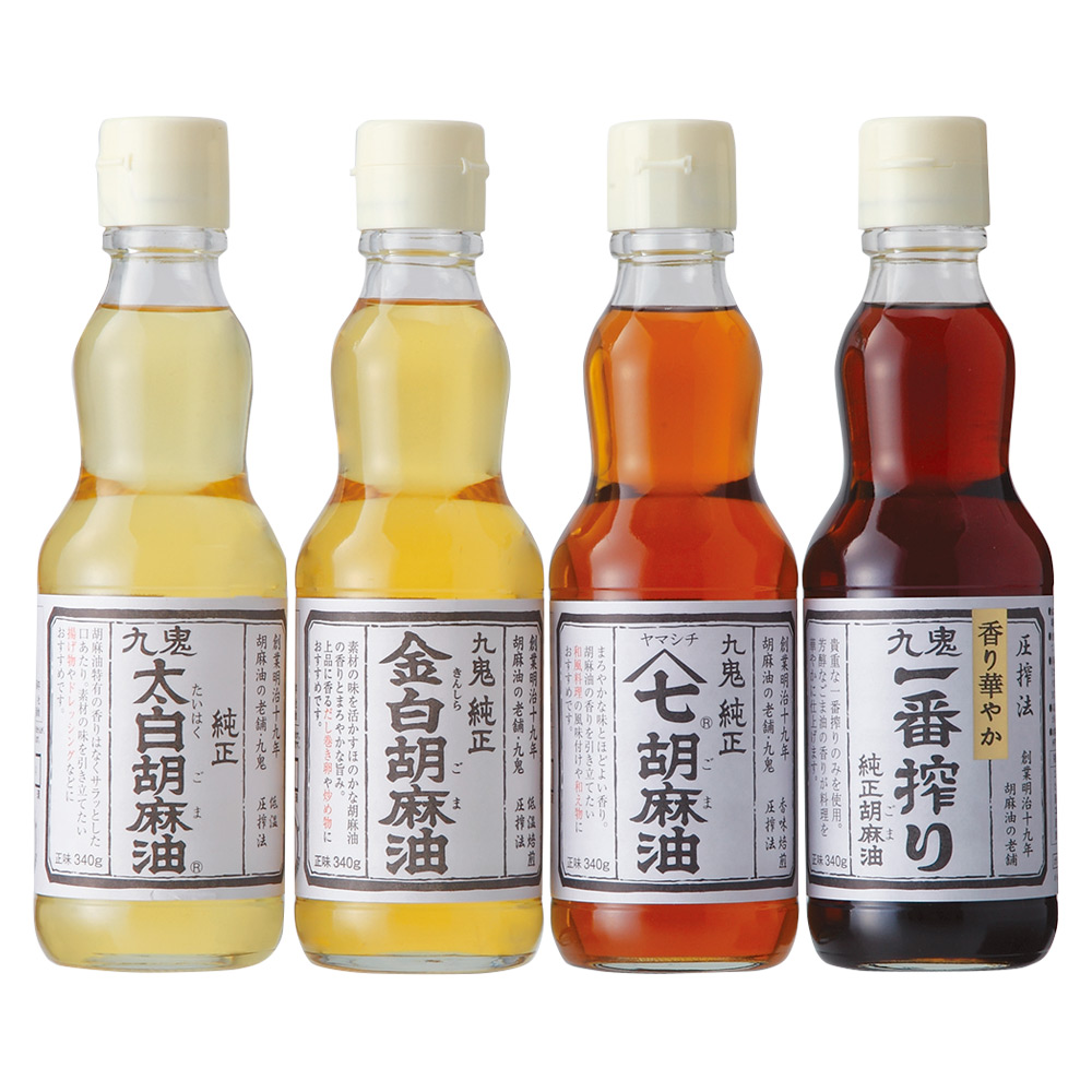 九鬼太白純正胡麻油・金白純正胡麻油・ヤマシチ純正胡麻油・一番搾り純正胡麻油 各340g