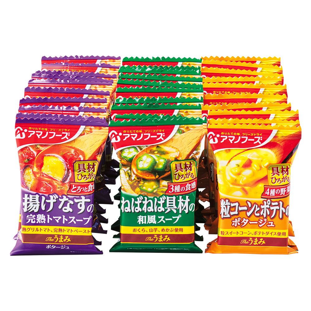 揚げなすの完熟トマトスープ、3種のねばねば具材の和風スープ、粒コーンとポテトのポタージュ 各10