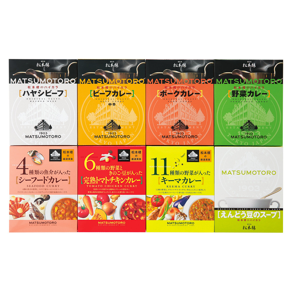 ハヤシビーフ・ビーフカレー・ポークカレー・野菜カレー各200g、シーフードカレー・完熟トマトチキンカレー・キーマカレー各180g、えんどう豆のスープ160g