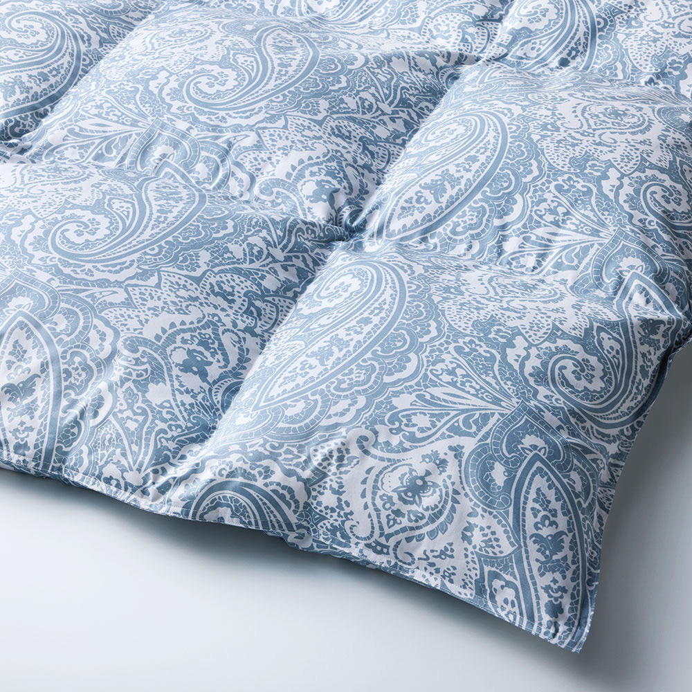 イングランド産ホワイトダックダウン90%の上質な羽毛を使用。ダウンパワー370dpでボリューム感があります。側地はサテンで仕上げました。