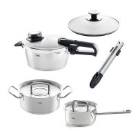 フィスラーの圧力なべ、キャセロール20cm、ソースパン16cm、ガラス蓋22cm、トングが各1個ずつ入った福袋