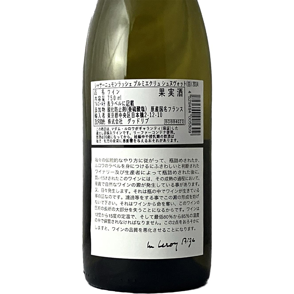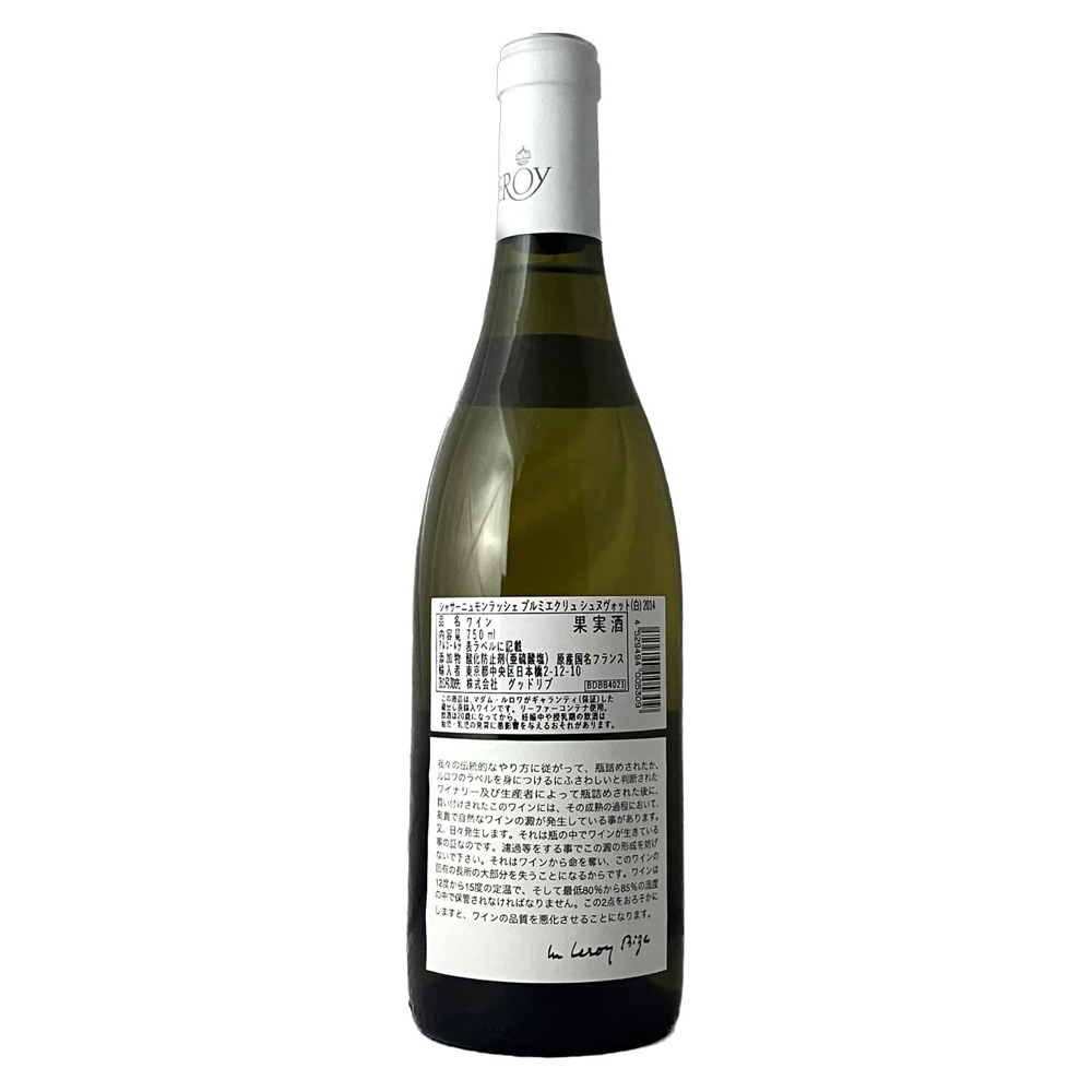 マダム・ルロワの厳しいテイスティングによるチェックの上で買い求めた良質のワインを、飲み頃を迎えるまでルロワ社のセラーで熟成。深い味わいを追求したトラディショナルなスタイルのワインです。シュヌボットは特級畑ル・モンラッシェに近く、ピュリニーモンラッシェ村との境界線付近に広がる1級畑。豊かな果実味とミネラル感が感じられ、熟した柑橘類や白桃を思わせる柔らかさも魅力的です。
