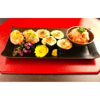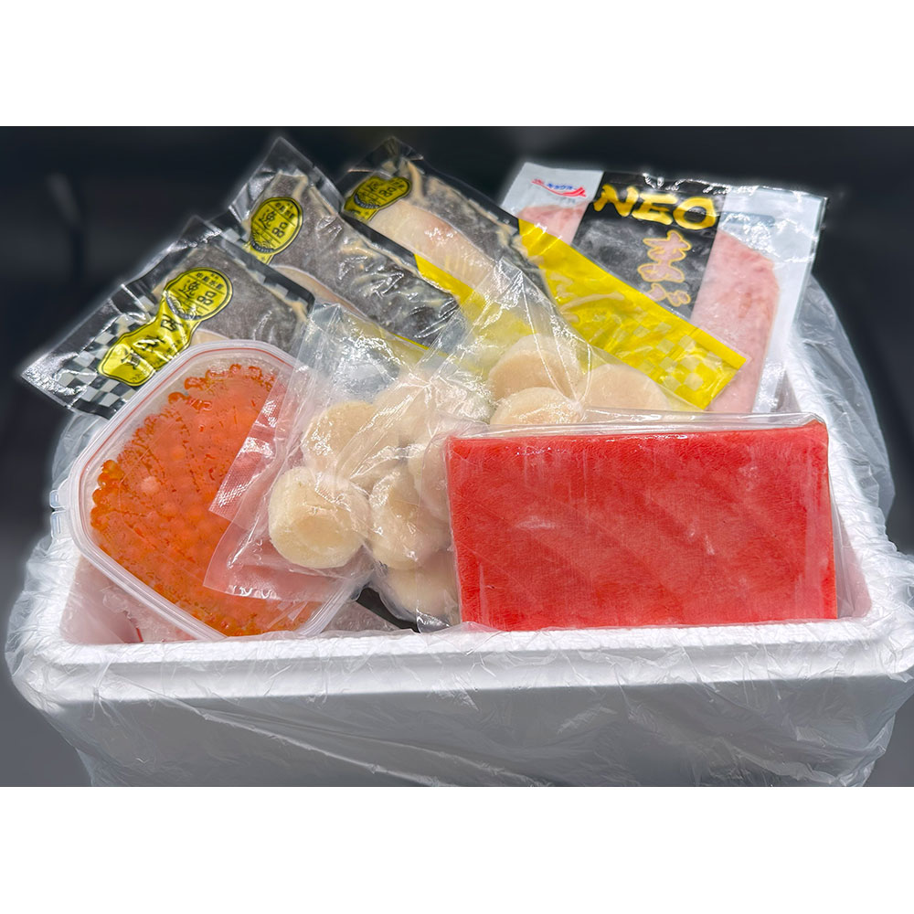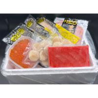 - 養殖本まぐろ赤身180g×1pc、まぐろたたき250g×1pc、ホタテ貝柱100g(6粒前後)×2pc、ロシア産原料いくら醤油漬80g×1pc、銀だら西京漬×3切