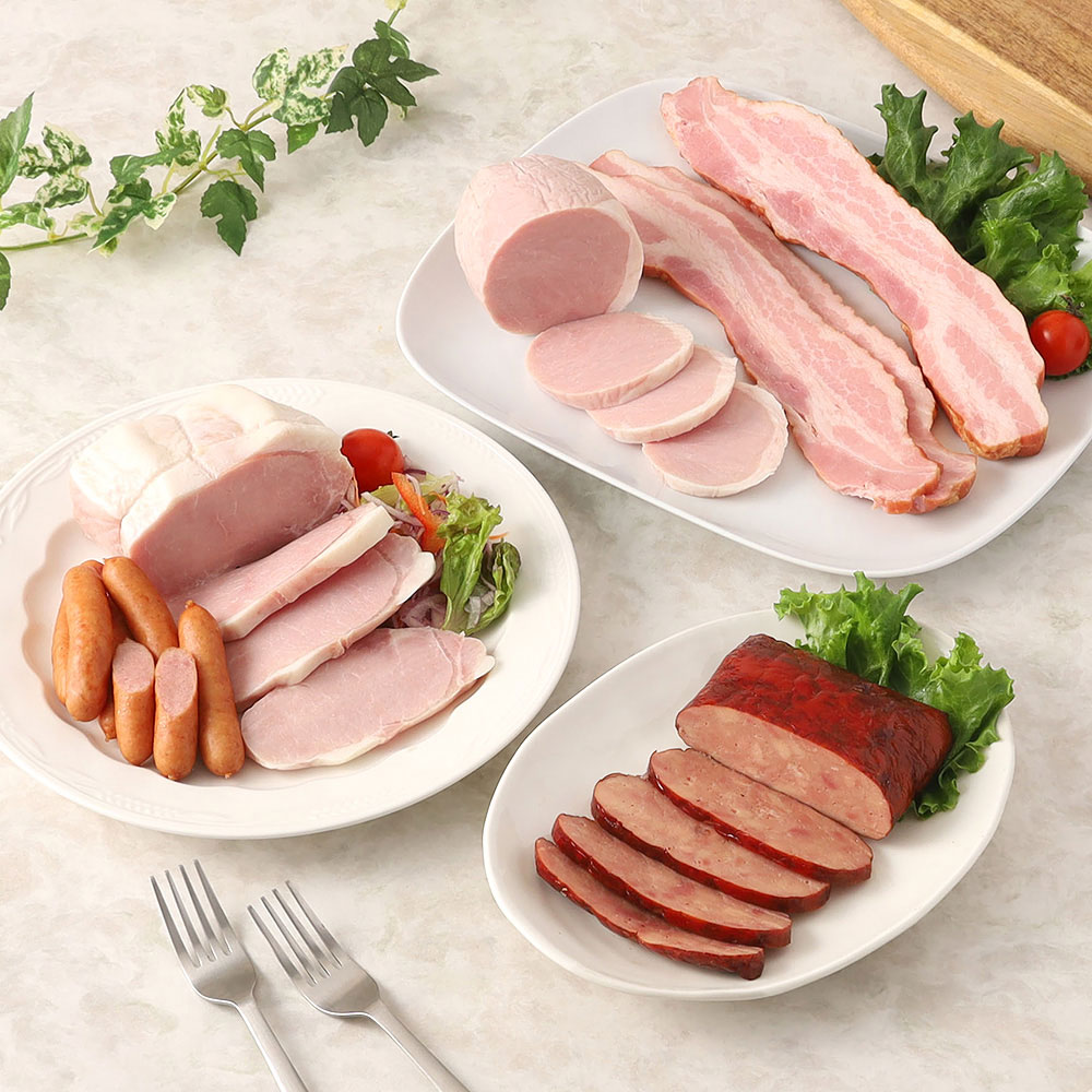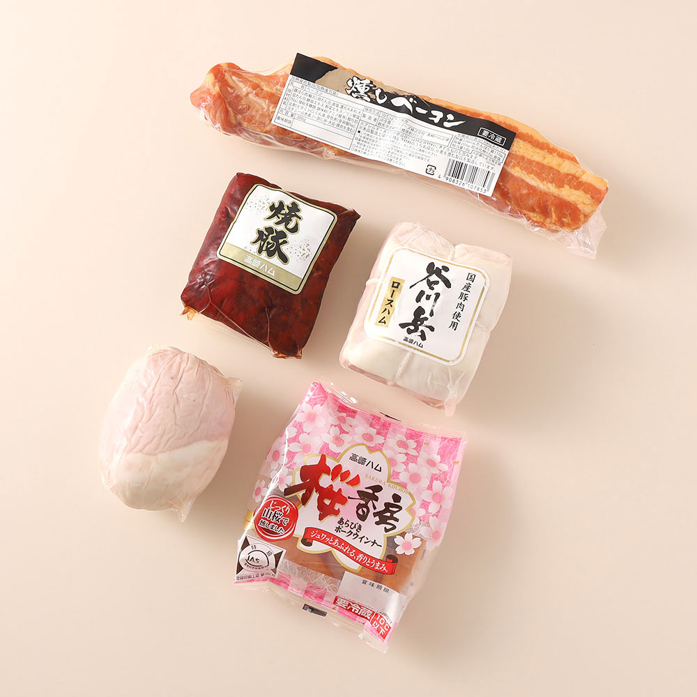 - 谷川岳360g、ホワイトロースハム300g、燻しベーコン300g、焼豚240g、桜香房あらびきウインナー90g
