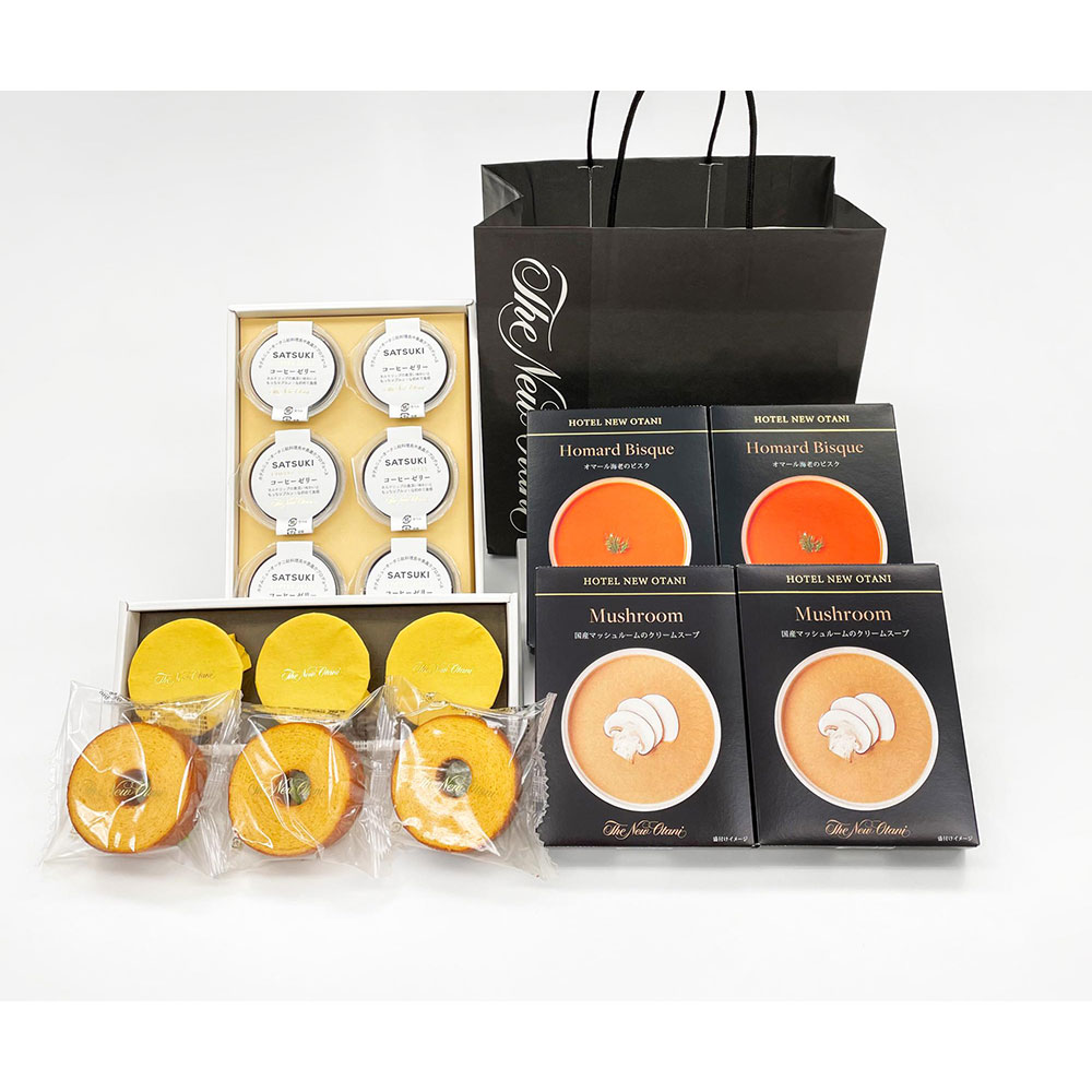 - SATSUKIコーヒーゼリー(6個入)×1、マンゴープリン(3個入)×1、バウムクーヘン(S)×3、国産マッシュルームのクリームスープ(150g)×2、オマール海老のビスク(150g)×2