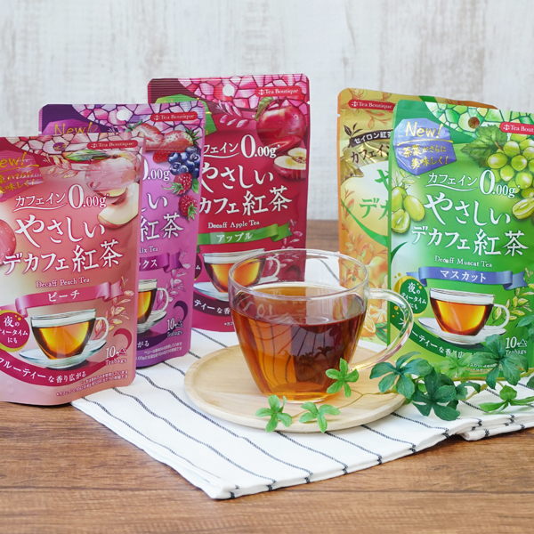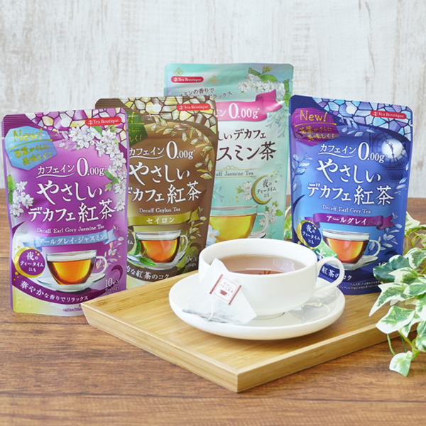 - やさしいデカフェ紅茶(セイロン・アールグレイ・アップル・マスカット・ピーチ・ベリーミックス・オレンジ・アールグレイ ジャスミン)各1.2g×10袋、やさしいデカフェジャスミン茶1.3g×17袋、やさしいデカフェ紅茶プレミアム(はちみつ瀬戸内レモン・ 国産苺)各1.5g×8袋