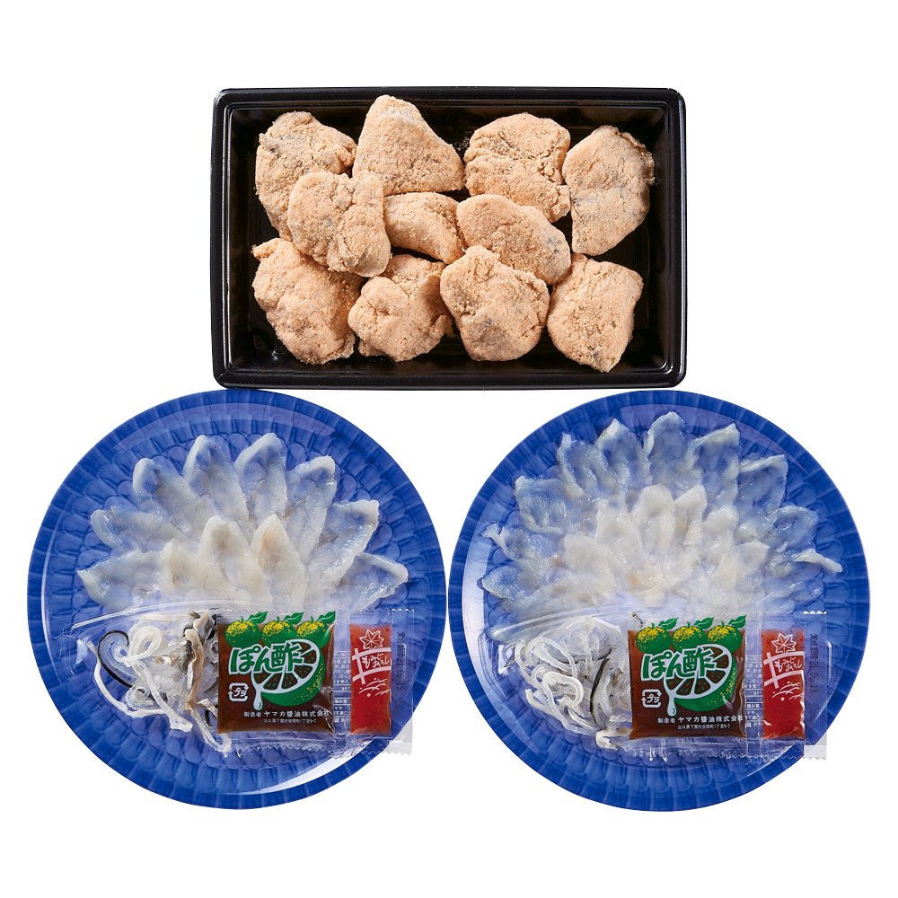 とらふく刺身20g×2、とらふく皮湯引き10g×2、まふく唐揚げ200g、ぽん酢・もみじおろし各2 ※原料原産地:とらふぐ(国産・養殖)、まふぐ(国産・天然)
