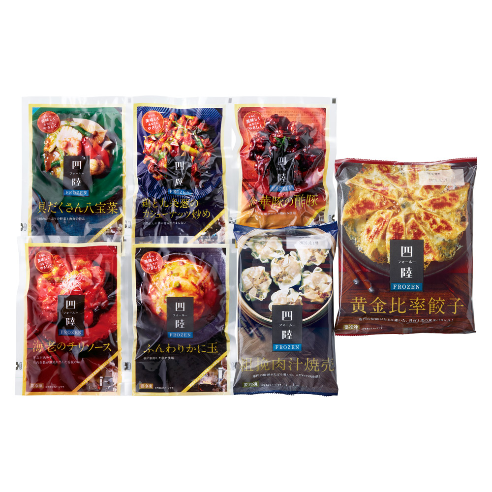 海老のチリソース150g・金華豚の酢豚150g・具だくさん八宝菜170g・ふんわりかに玉185g・鶏と九条葱のカシューナッツ炒め150g・黄金比率餃子180g・粗挽肉汁焼売204g 各1袋