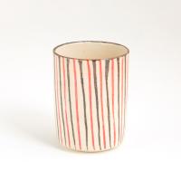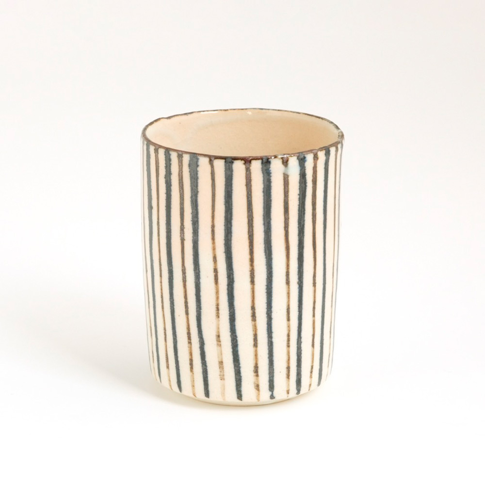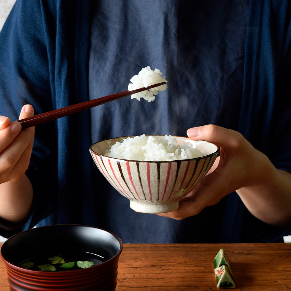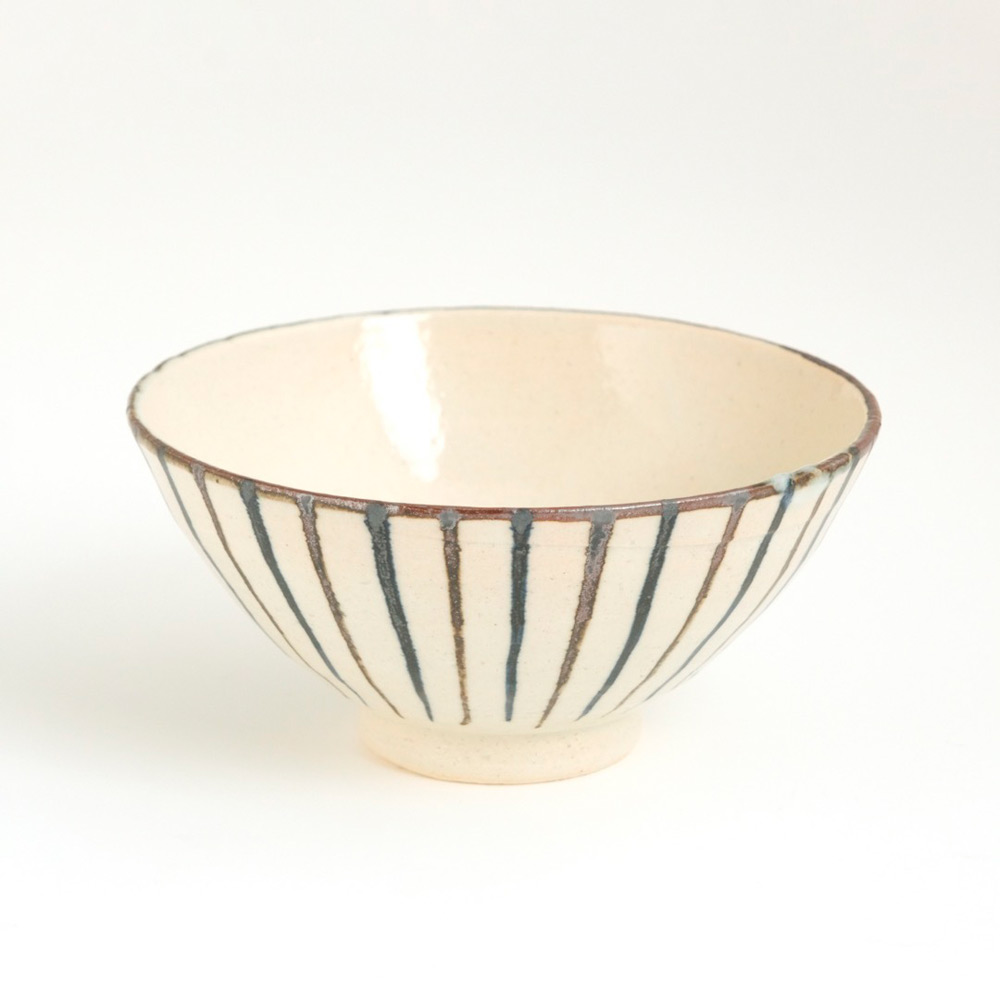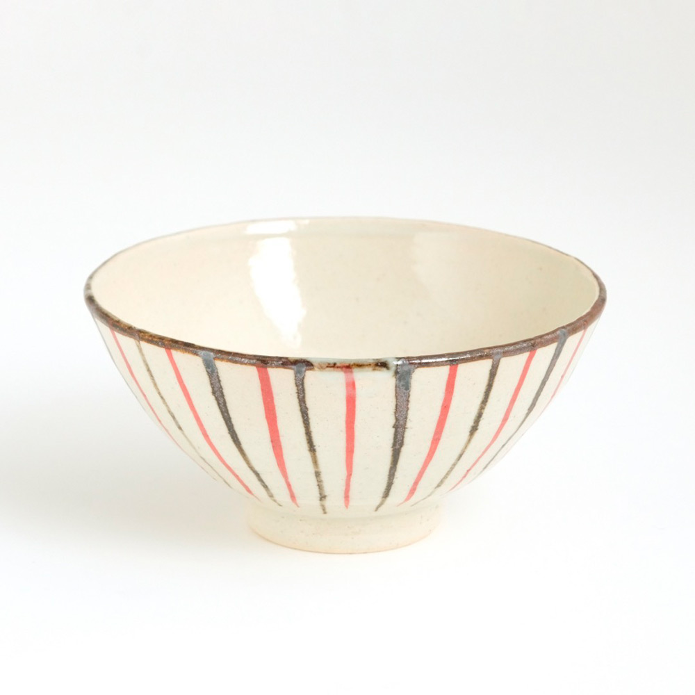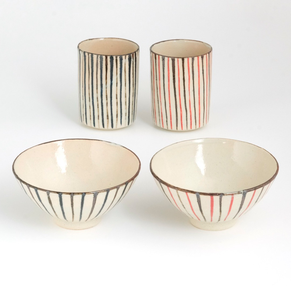 温もりのある陶器に、手描きで丁寧に十草文様を施した夫婦揃です。十草文様とは、植物の木賊のように、縦まっすぐに並んだ縞文様のこと。青色と朱色を織り交ぜた親しみやすい線文は、多くの方から愛されています。