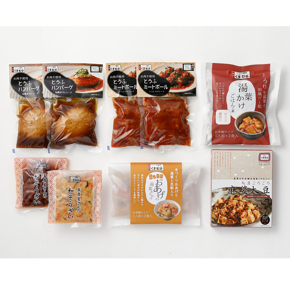 とうふハンバーグ 和風おろしソース2袋、とうふミートボール トマトベジソース(5個入)2袋、豆腐屋さんの和そうざい金時豆(100g)1袋、豆腐屋さんの和そうざい卯の花(100g)1袋、ふっくらおあげの湯葉あんかけ(2食入)1袋、湯葉かけごはんの素(2食入)1袋、麻婆大豆(180g)1箱