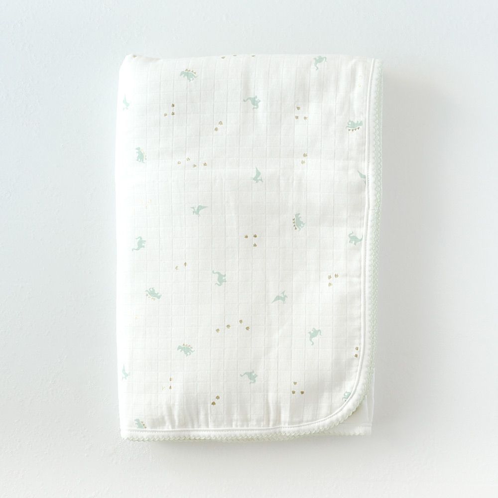やわらかな綿ガーゼ生地に、金銀の箔プリントをあしらったブランケットです。パイピングには柄に合わせたステッチを施しており、アクセントに。中わた入りでふっくらとしているので、掛けふとん代わりにも使えてオールシーズン活躍します。