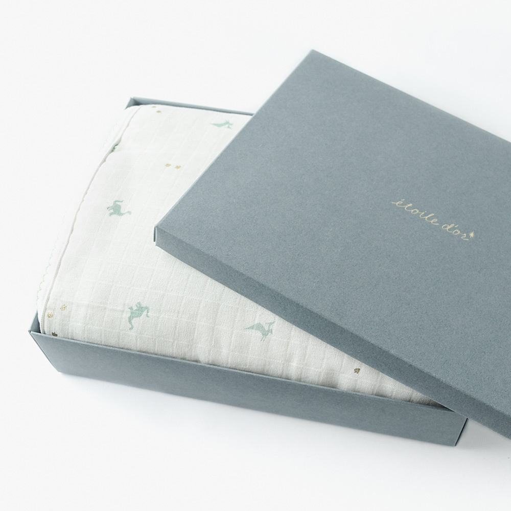 中わた入りでふっくらやわらかなガーゼケット。ギフトボックス入りでプレゼントにも最適です。
