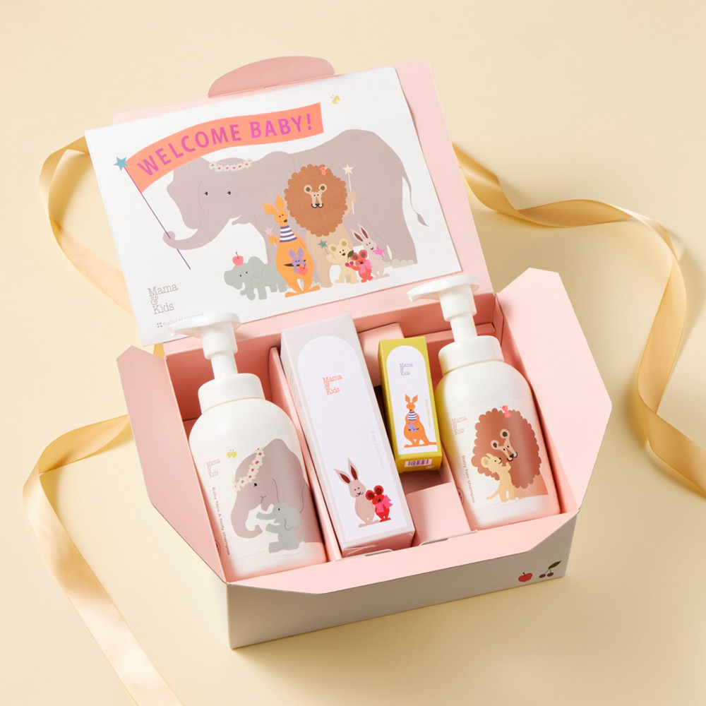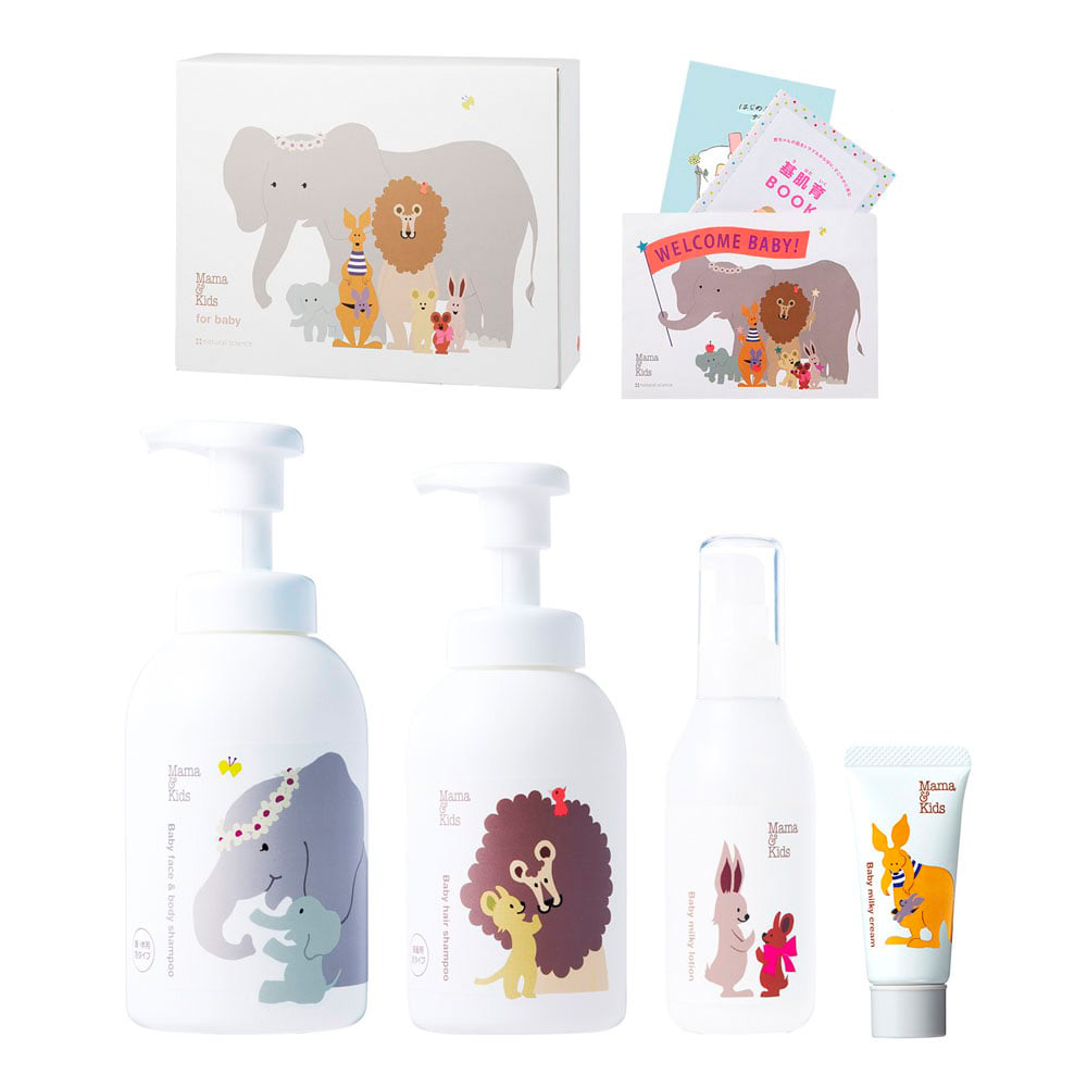 ベビーの洗ってうるおすの基本セット。かわいい動物のおやこの世界「いっしょがいいね。R」限定デザインで、スキンケア時間をより楽しく。