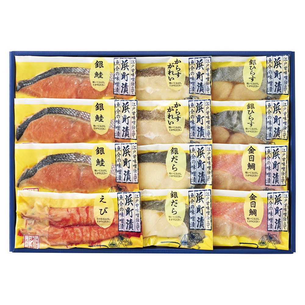 銀鮭60g×3、金目鯛70g×2、銀だら・からすがれい・銀ひらす各60g×2、えび(2尾入)