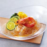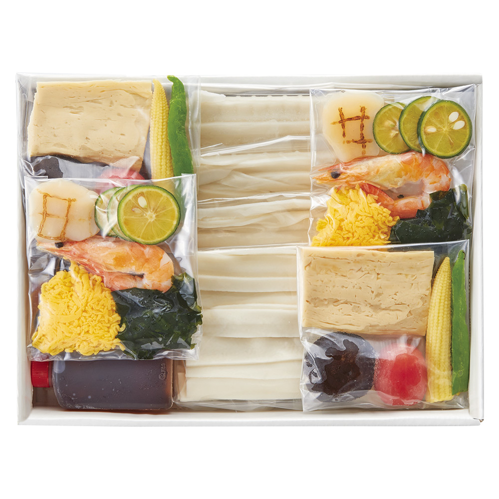 葛きり100g・特製めんつゆ80ml各4、海老とすだち(海老・ほたて貝柱・わかめ・錦糸玉子・すだち)・湯葉と野菜(湯葉・椎茸煮物・ミニトマト・ヤングコーン・甘長とうがらし)各2