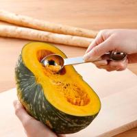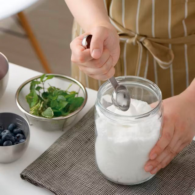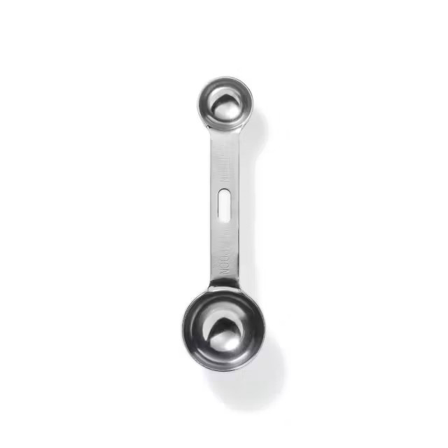 大さじ・小さじが柄の両端についているので、これ1本で計量できるから洗いものが減り、収納性もよいです。中央の穴にフックをかけ、吊るして収納することも。1.5mmと、しっかりと厚みがあるので、野菜のくり抜きや固まった塩・砂糖などを崩す際に使用しても曲がりにくく、丈夫です。また、スプーンの皿に深さがあるので液体を計量するときもこぼれにくくなっています。
