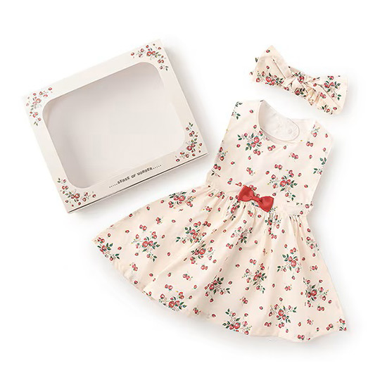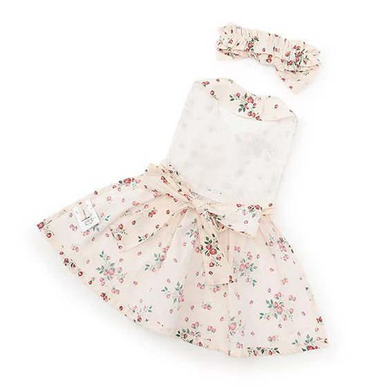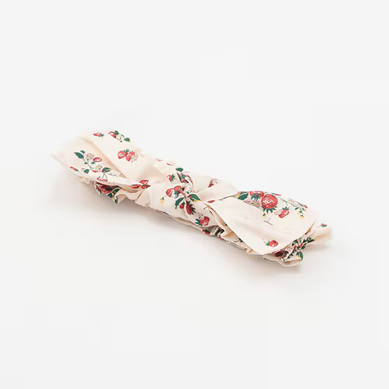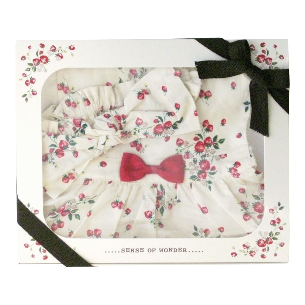 野イチゴをプリントした可愛らしいエプロンとヘアバンドのセット。プレゼントにぴったりなオリジナルボックス付きの商品です。
