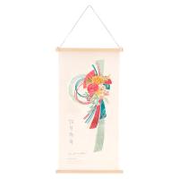 掛け軸のような木製のバーが付いており、和風感あふれる、華やかでおめでたい雰囲気の刺しゅうタペストリーです。