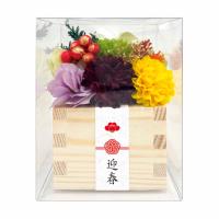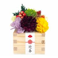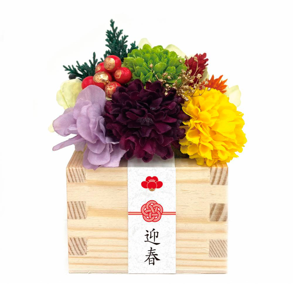玄関等に置くと新年のおめでたい雰囲気に。桝に自然葉やアーティフィシャルフラワーなどをアレンジしたお正月飾りです。