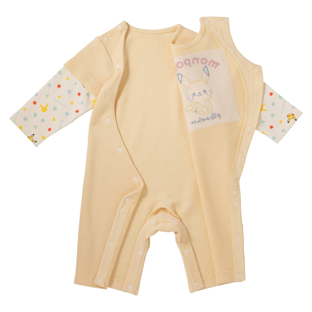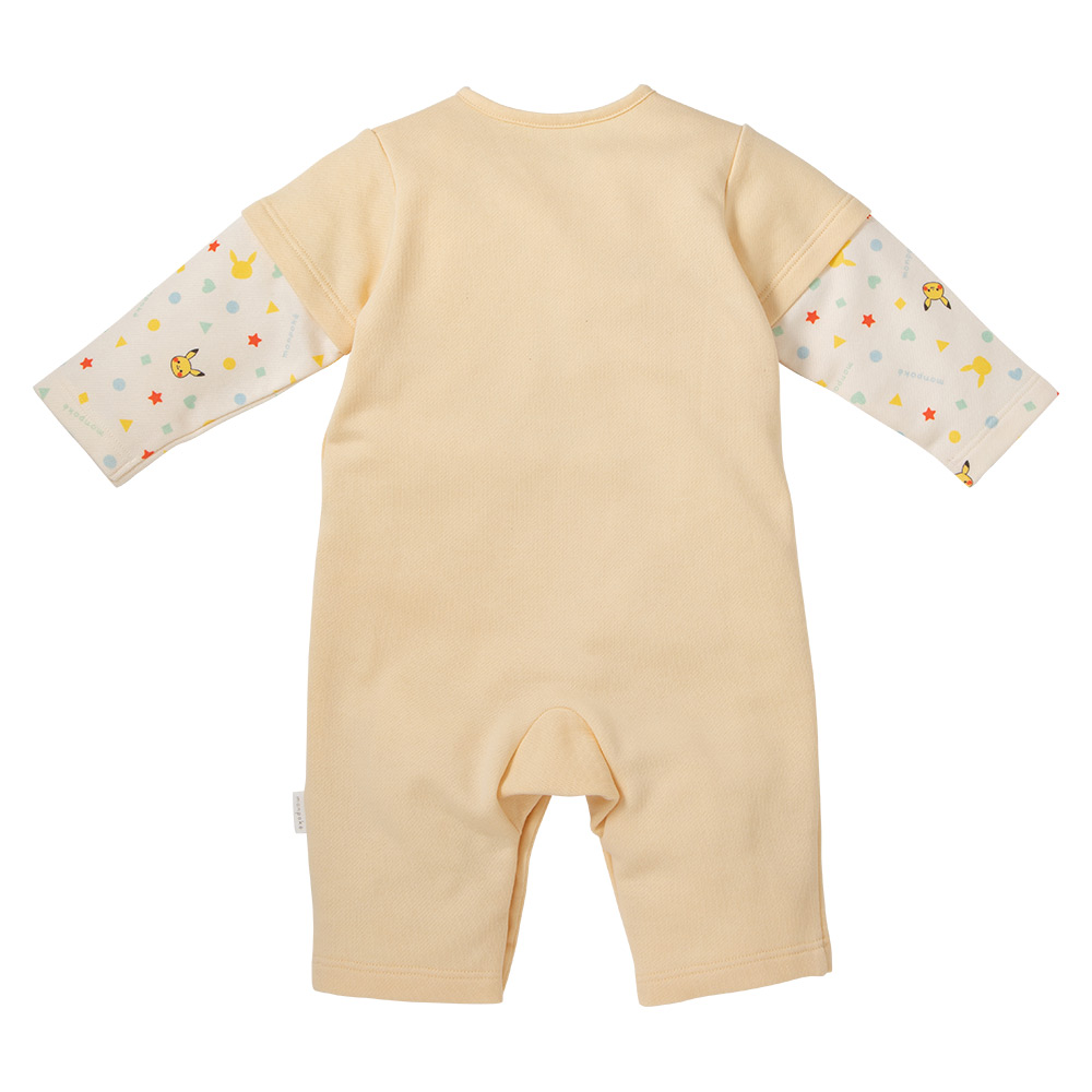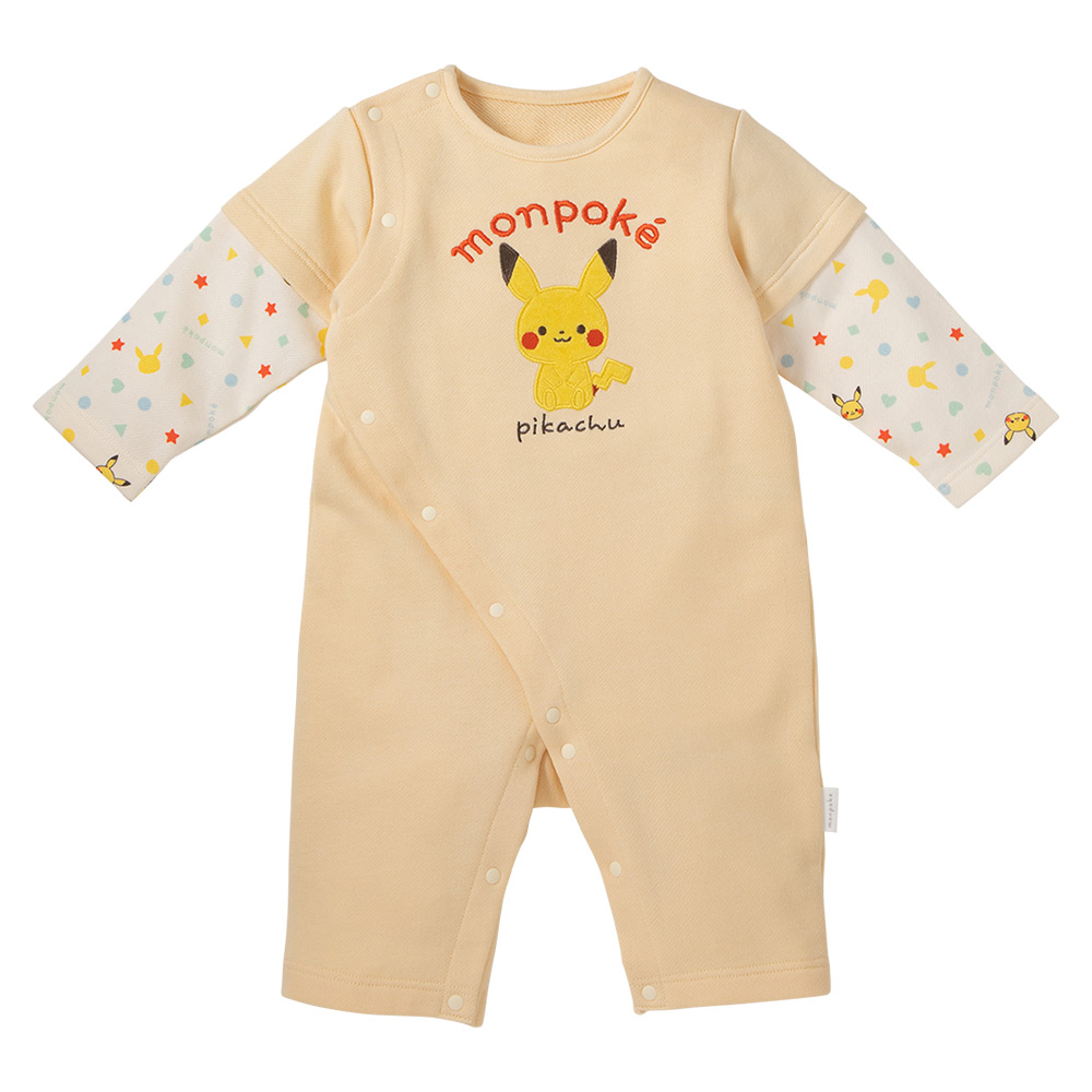 長袖と半袖を重ね着した風のレイヤード調のロンパース。