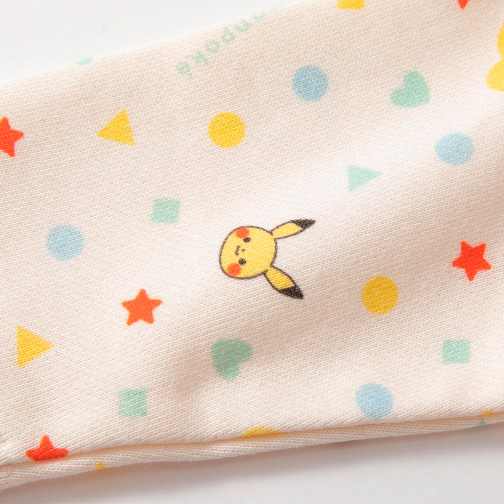 胸にはピカチュウの刺しゅう、総柄部分にもピカチュウのプリントが入っています。