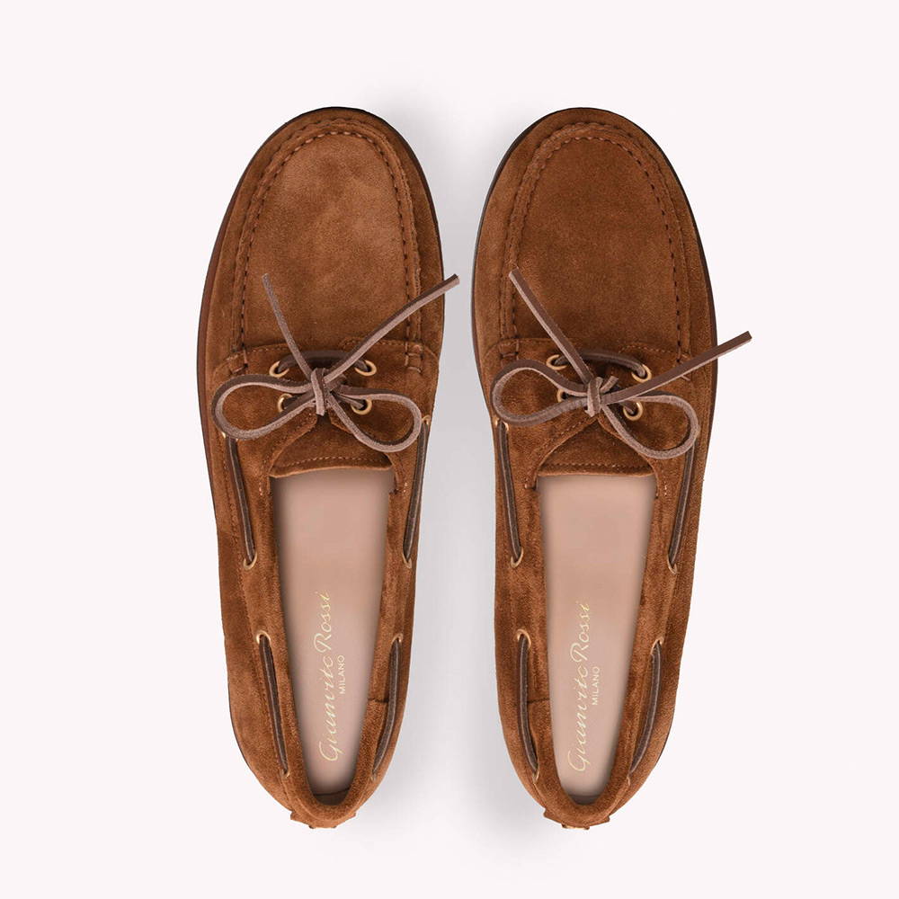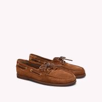 レザーレースとメタルアイレットが特徴のボートシューズです。背面にはメゾンのロゴがエンボス加工されています。ソールは軽量ラバーインソールで仕上げられています。
