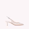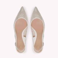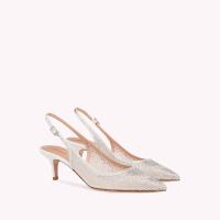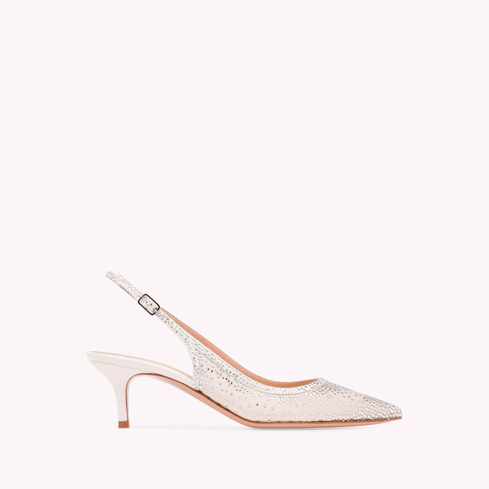 55mmのスティレットヒールを備えたエレガントなポインテッドトウタイプのRegina。上質なシースルーのオーガンザシルクを使用し、スエードのトリムで仕上げたこのパンプスには、まばゆいクリスタルがあしらわれています。