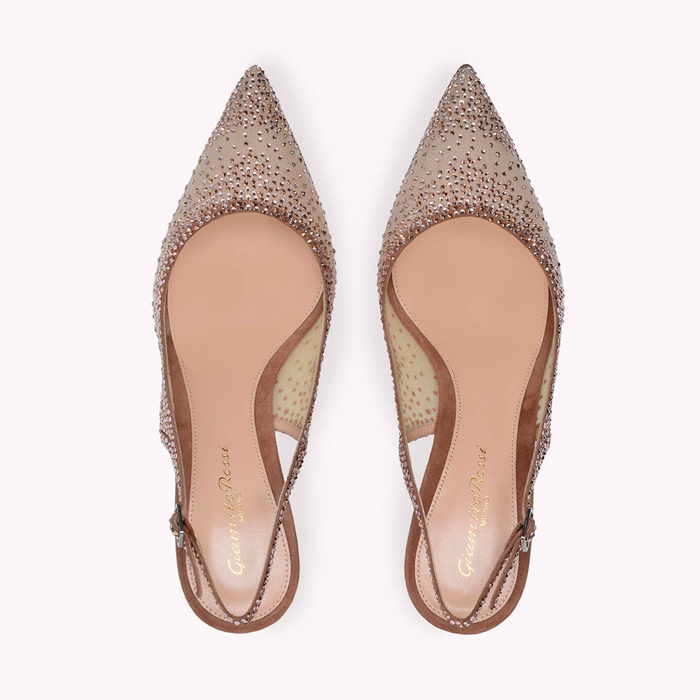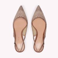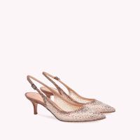 55mmのスティレットヒールを備えたエレガントなポインテッドトウタイプのRegina。上質なシースルーのオーガンザシルクを使用し、スエードのトリムで仕上げたこのパンプスには、まばゆいクリスタルがあしらわれています。