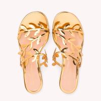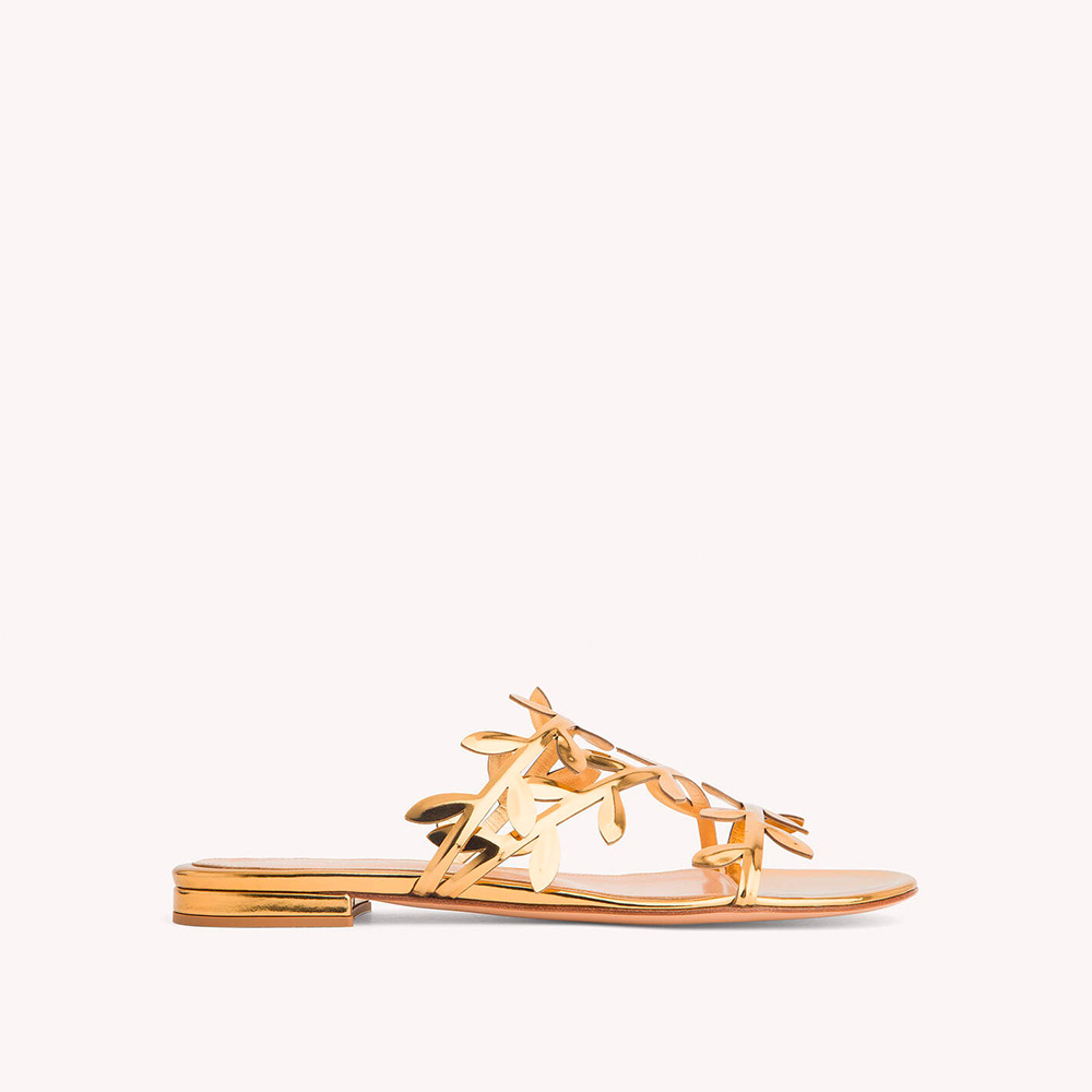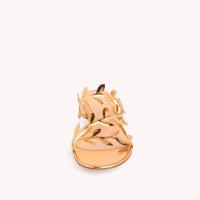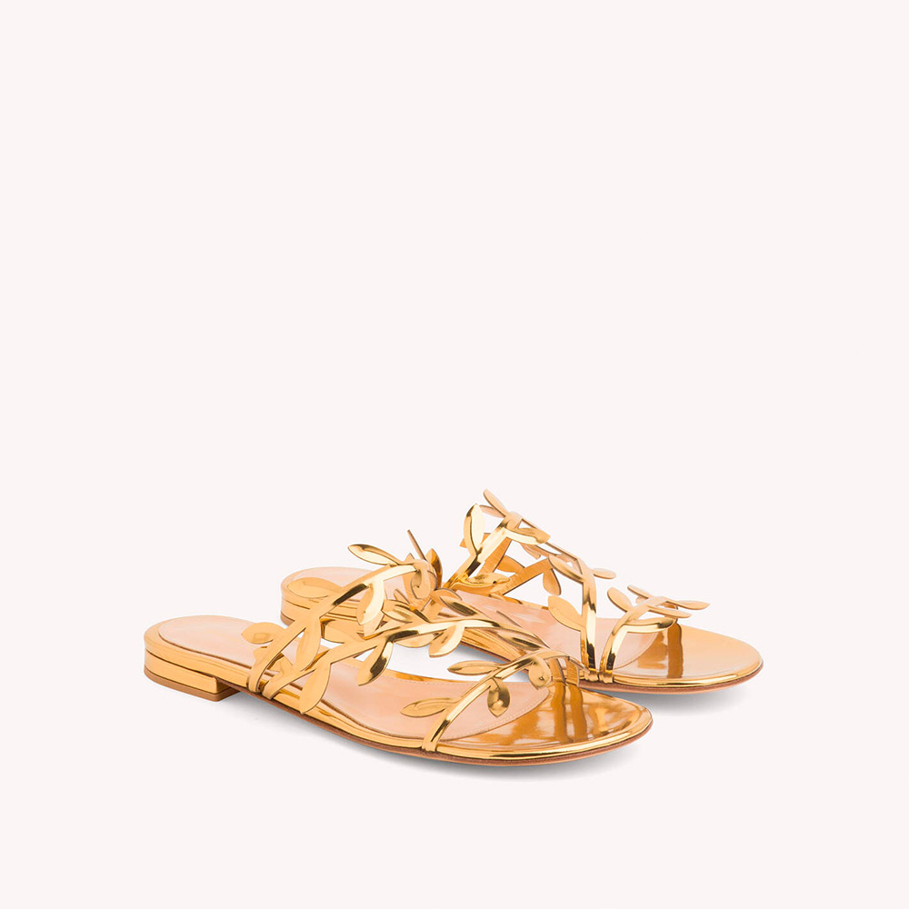 ミラー調のレザーから丹念に作り上げたFlavia 05は、高さ10mmのブロックヒールを備えた、ラウンドトゥ・ローヒールのスライダーサンダル。アシンメトリーなデザインが特徴。アッパーにはレーザーカットのリーフモチーフがあしらわれています。