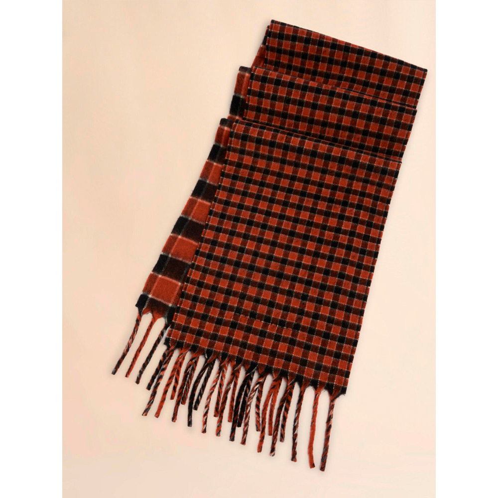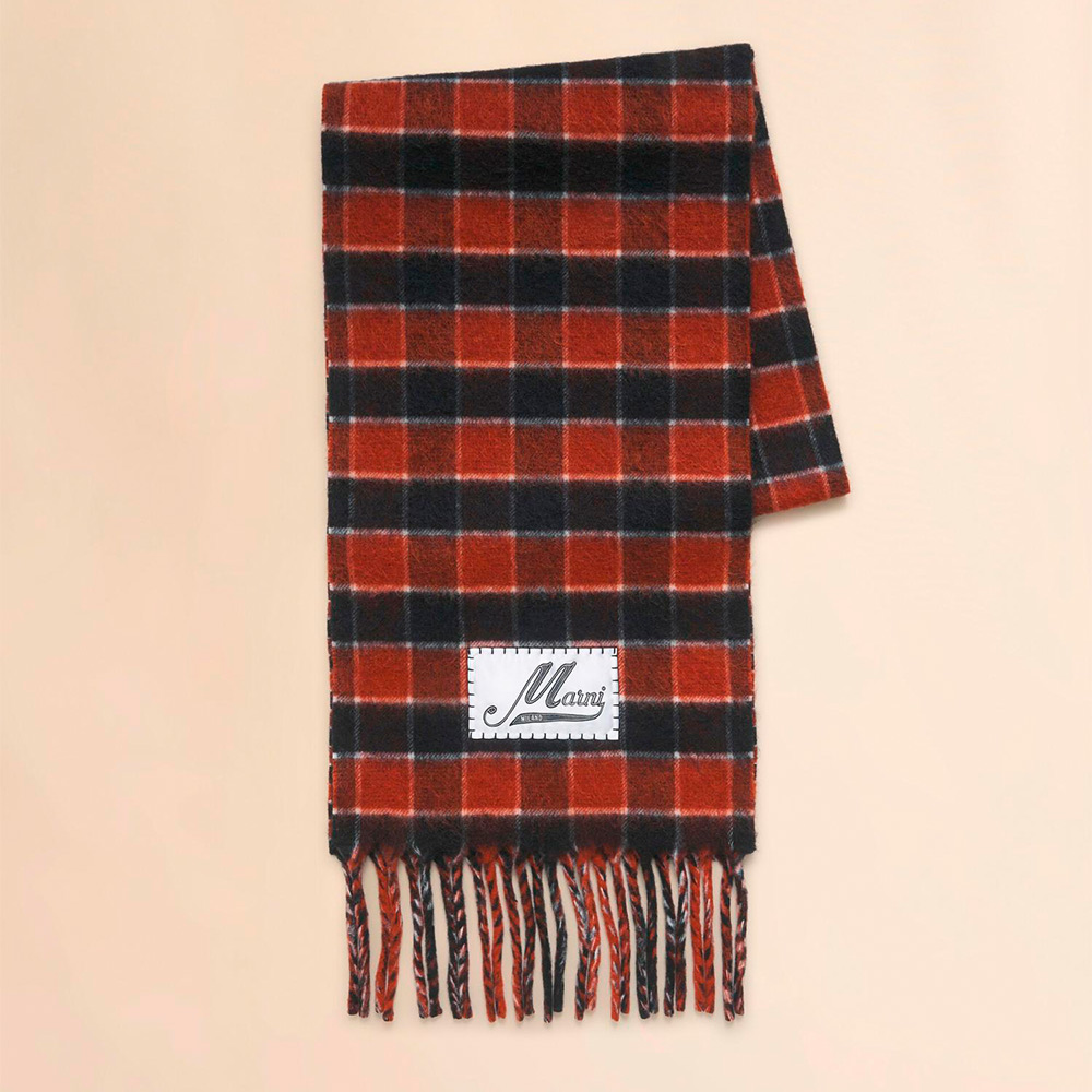 表面の大きいチェック柄、裏面の細かなチェック柄をリバーシブルで使用できる大判のマフラー。ロゴラベルがアクセントに。