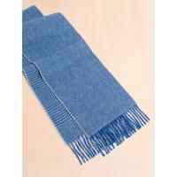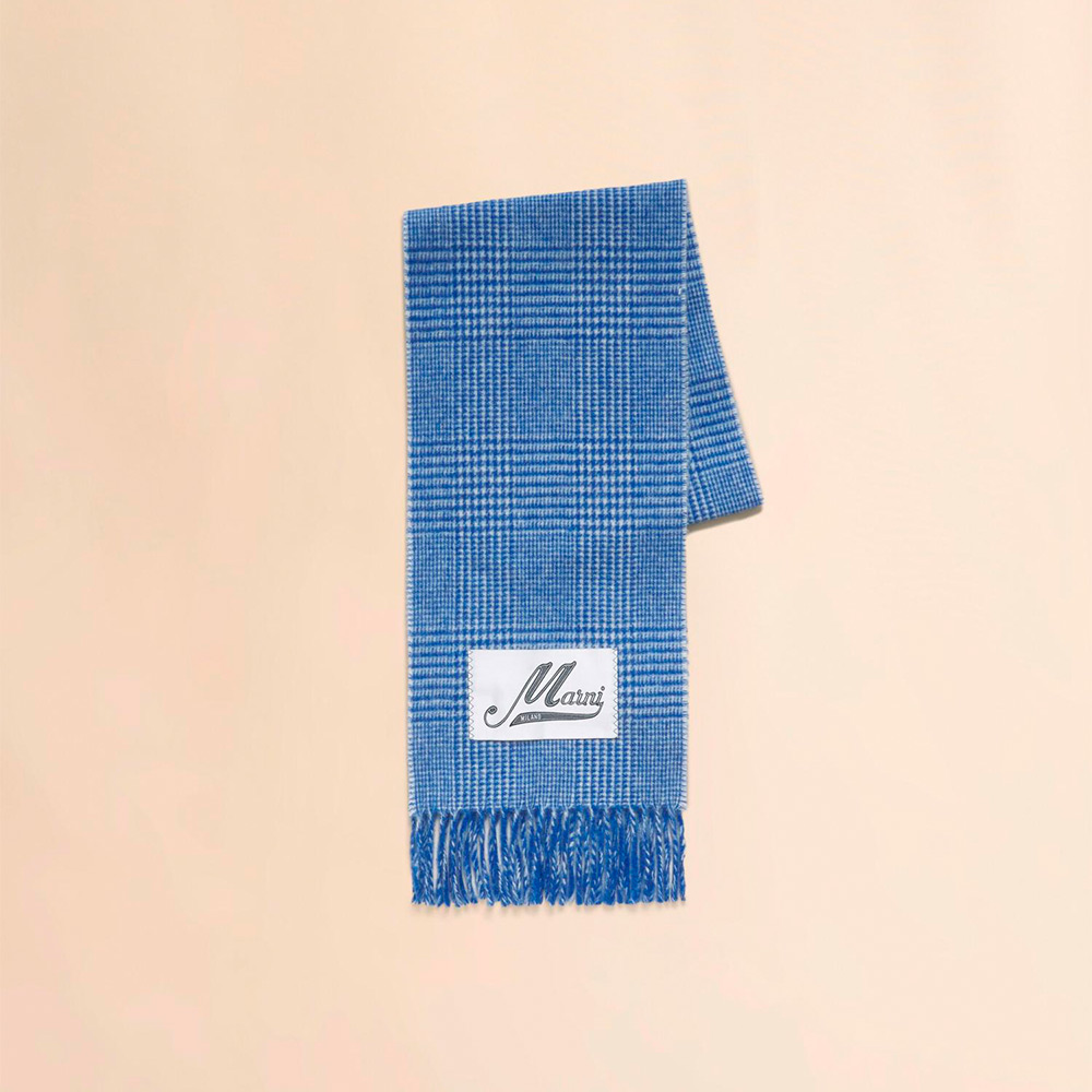 クラシックなチェック柄のウール混マフラー。ロゴラベルがアクセントに。