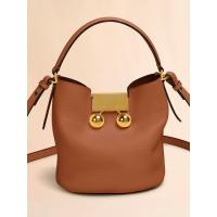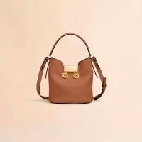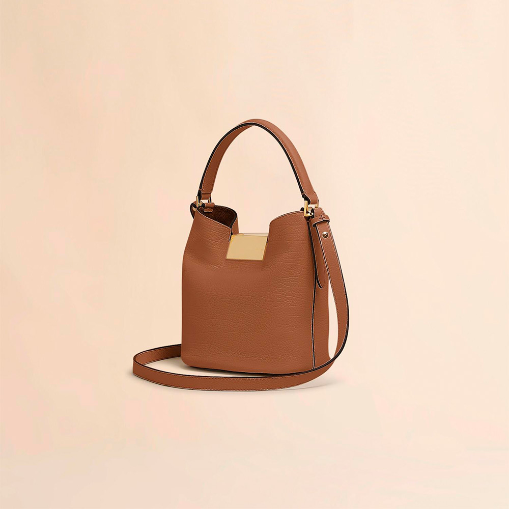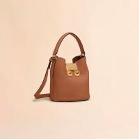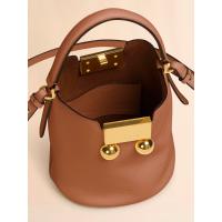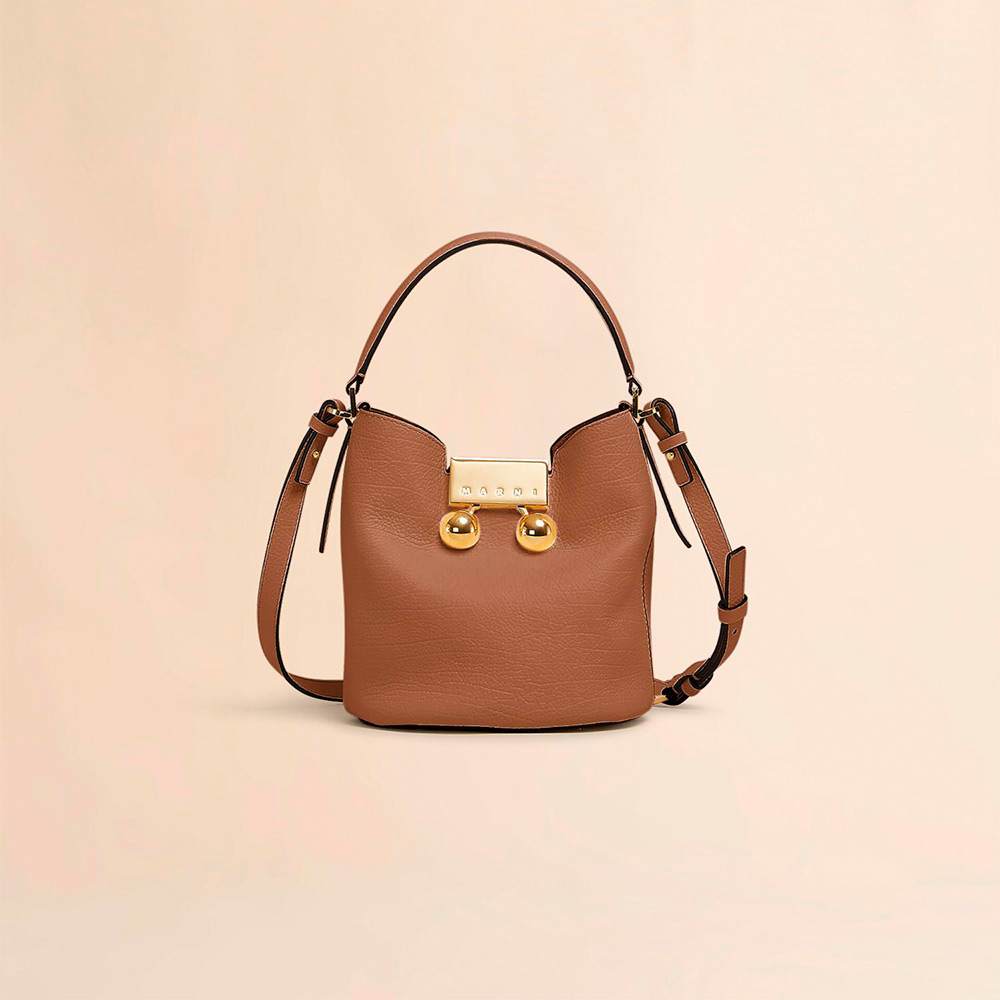 グレインレザー製の“TRUNKAROO”バケットバッグ。内側にスロットポケット、長さ調節可能なショルダーストラップ付き。メタルクロージャーがアクセントに。