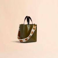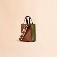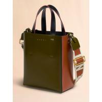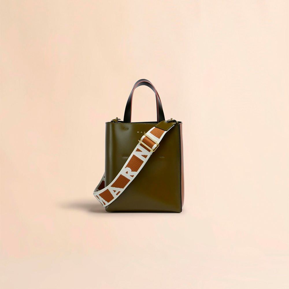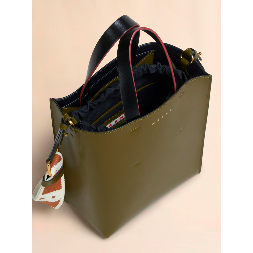 ポリッシュカーフレザーの“MUSEO”ミニバッグ。取り外し可能なショルダーストラップ、内側にスロットポケット、布製の巾着バッグ付き。フロントにロゴ入り。