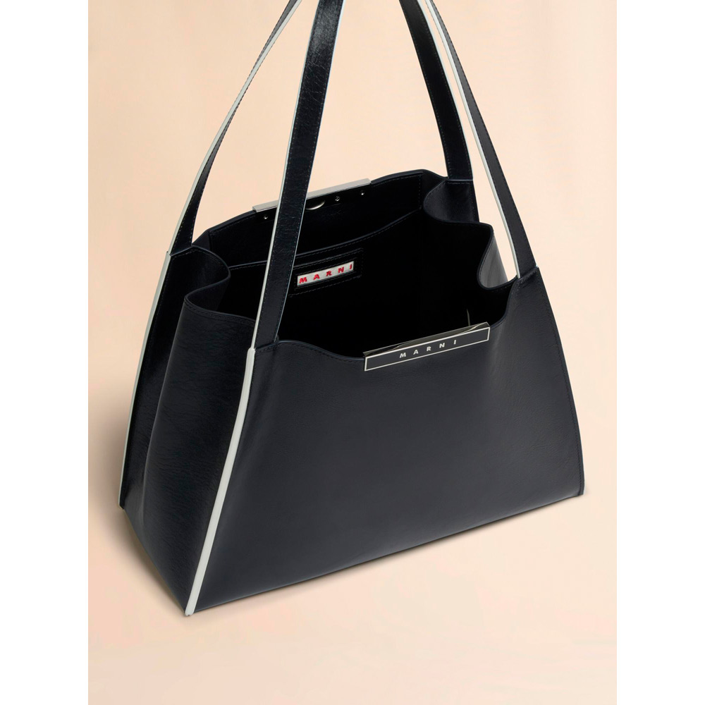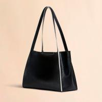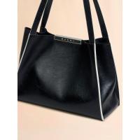 光沢のあるシャイニーカーフレザー製の“CRESTA”E/Wスモールトートバッグ。コントラストカラーのパイピングと、シームレスにボディと繋がったハンドルが特徴。ロゴ入りのメタルプレートがアクセントに。