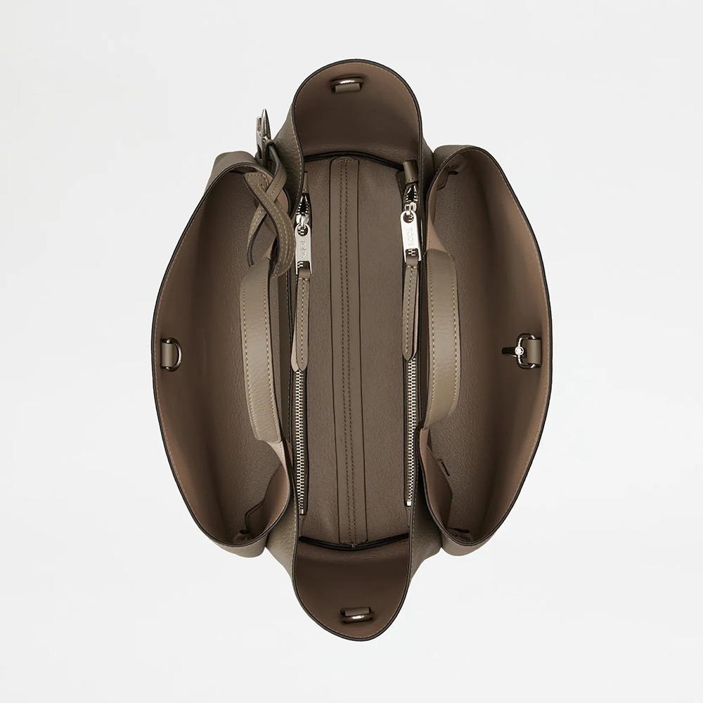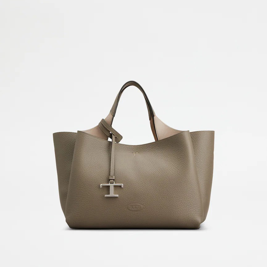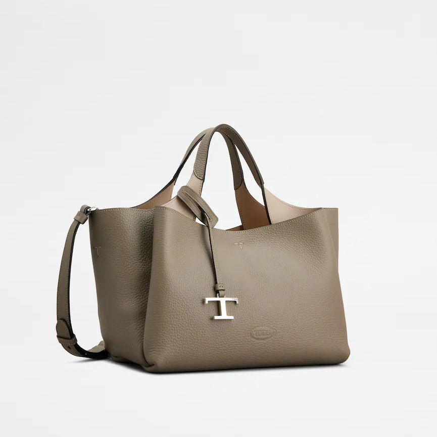 グレインの美しさが際立つ柔らかなレザーのバッグ。フロントにホットスタンプのトッズ ロゴ、フラット ハンドル、取り外し可能なショルダー ストラップを合わせました。内部の3つのコンパートメントはファスナー付きのポケットで仕切られています。T タイムレス メタル ペンダント、T ステッチをあしらい、トッズならではのアイコニックなディテールが光るエレガントなスタイルです。