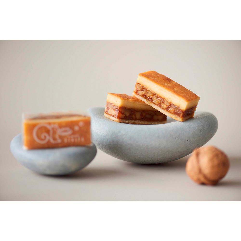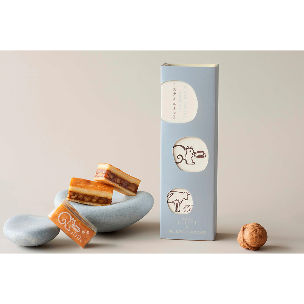 <ミスチ クルミッ子>バニラ、トンカ豆、クルミッ子のキャラメルソースを組み合わせた優しい味わいのチーズケーキの底に、風味豊かなガレットブルトンヌやクルミ、生キャラメルを敷き詰めました。「クルミッ子」を「Mr. CHEESECAKE」で包んだような、優しくやわらかい味わいのコラボレーションチーズケーキです。解凍の度合いによって異なる温度と風味がお楽しみいただけるのも魅力の一つです。<Mr. CHEESECAKE クルミッ子>「Mr. CHEESECAKE」を鎌倉紅谷の代表商品「クルミッ子」で表現。クルミをぎっしり詰め込んだ自家製キャラメルの上に、サワークリームと、クリームチーズをベースにしたトンカ豆が香る爽やかなチーズクリーム、通称“ミスチ クリーム”を塗り重ね、卵を使用しないバニラ風味の生地でサンドし焼き上げました。