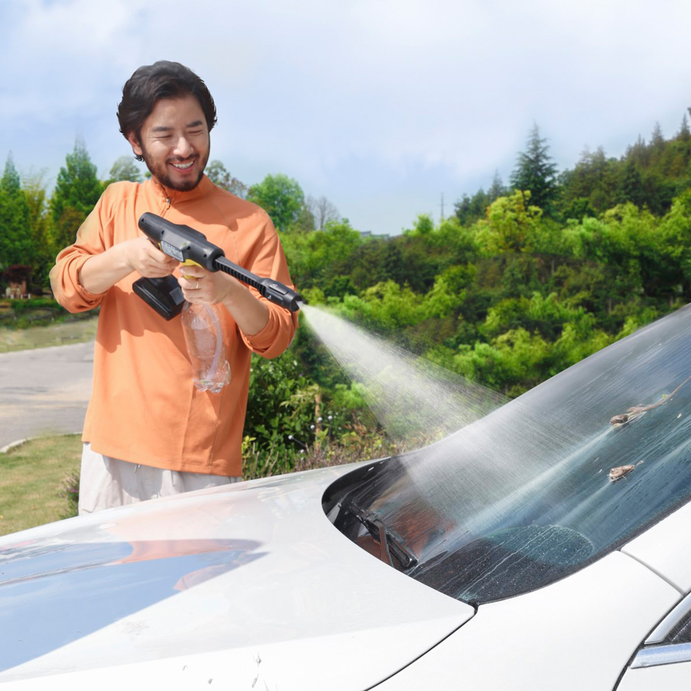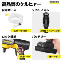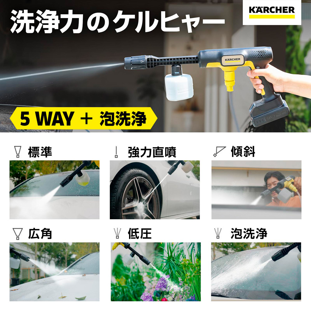 バッテリータイプのコンパクトな高圧洗浄機が登場。家の周りもレジャーなどの外出先でも気になる汚れをパワフルに洗浄。<手軽に汚れを除去>ノズルのつけかえ不要で5種類の水流を扱える5in1ノズル搭載。<面倒な準備も片付けも簡単>バケツの水やペットボトルの水でも洗浄可能。水道ホースや水源不要。<コンパクトで軽い操作性>片手でも、しっかり洗える軽量モデル。<収納性抜群>シューズボックスなど置き場所にも困りません。