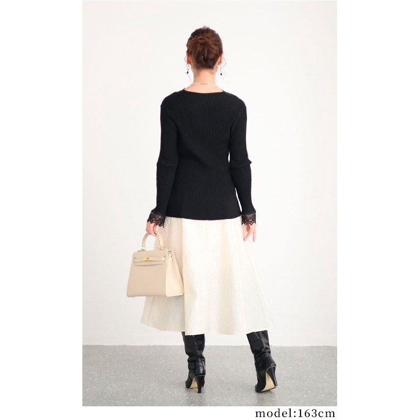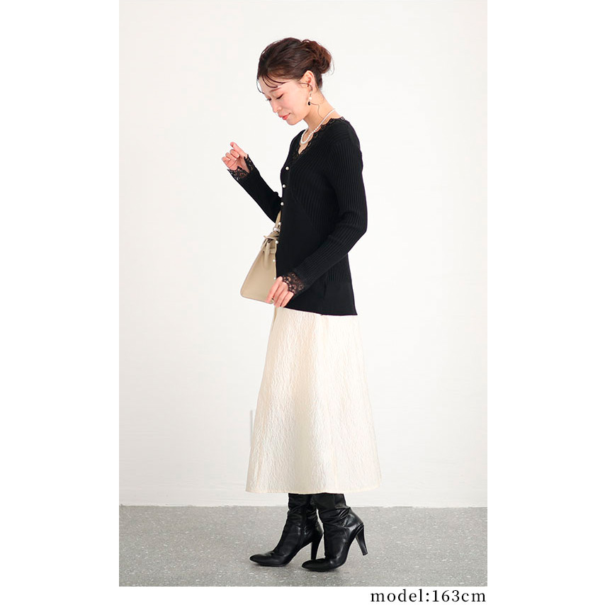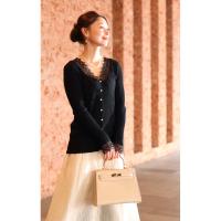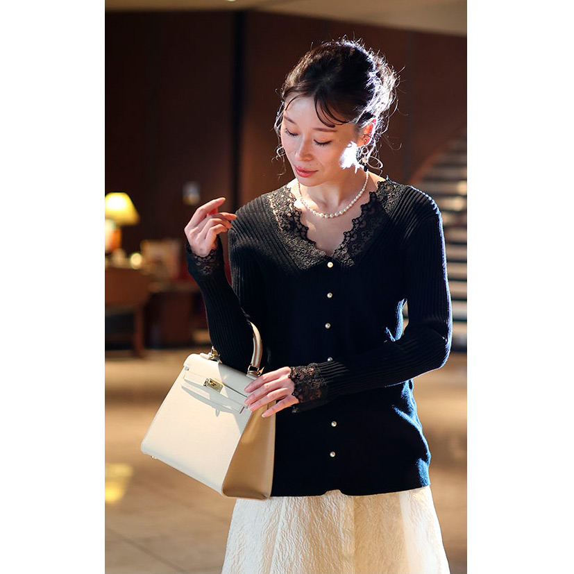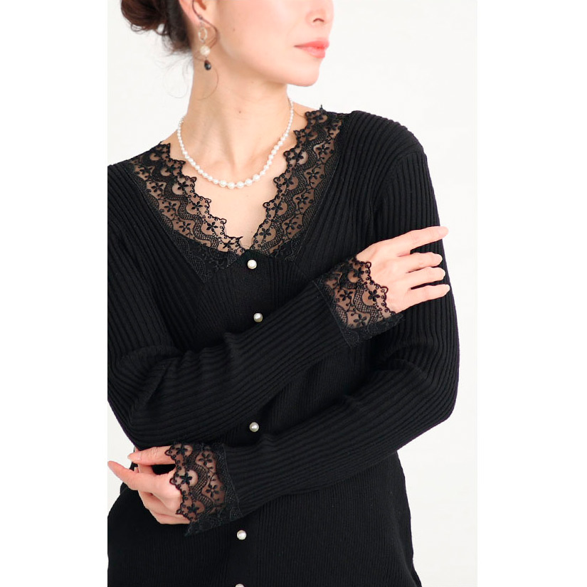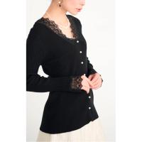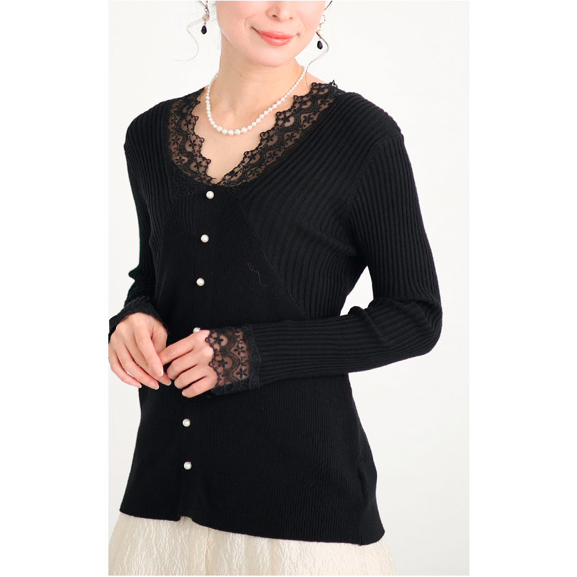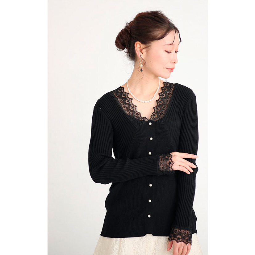 Vネックにレースがあしらわれているパールのボタンがアクセントのニットトップス。
