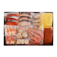 秋鮭切身3切(計90g)、たら切身3切(計90g)、鶏もも肉90g、ずわいがに爪・ボイル帆立・赤えび・牡蠣・とりごぼうつみれ 各3、ラーメン(生めん)110g、特製あわせ味鍋スープ140g