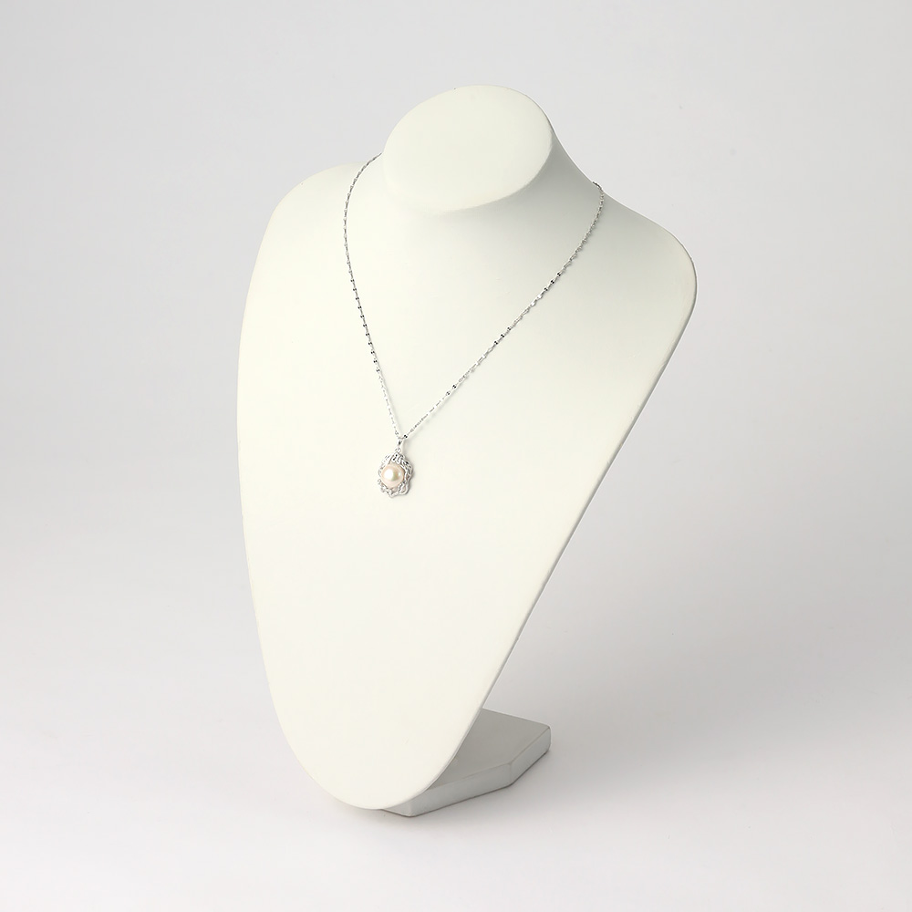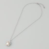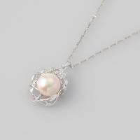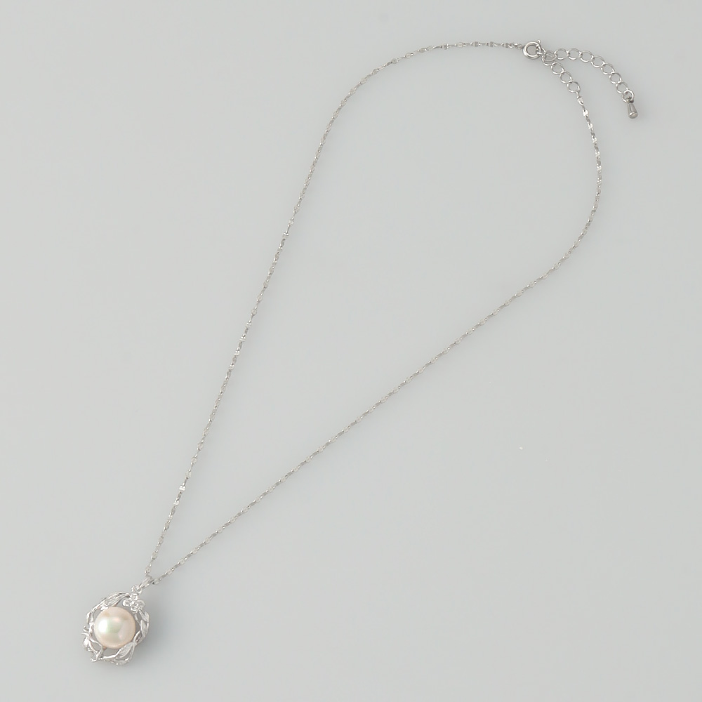 淡水養殖真珠約10mm1個(ホワイト系・ボタン型)、枠:シルバー(ロジウムメッキ)、チェーン:サージカルステンレス(316L)