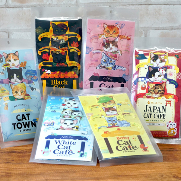 ブラックキャットカフェ(メープルティー)、ホワイトキャットカフェ(アップルティー)、キャットタウン(ダージリン)、キャットカフェ(アールグレイ)、ベビーキャットカフェ(ルイボスティー)、ジャパンキャットカフェ(煎茶)各種ティーバッグ×3個