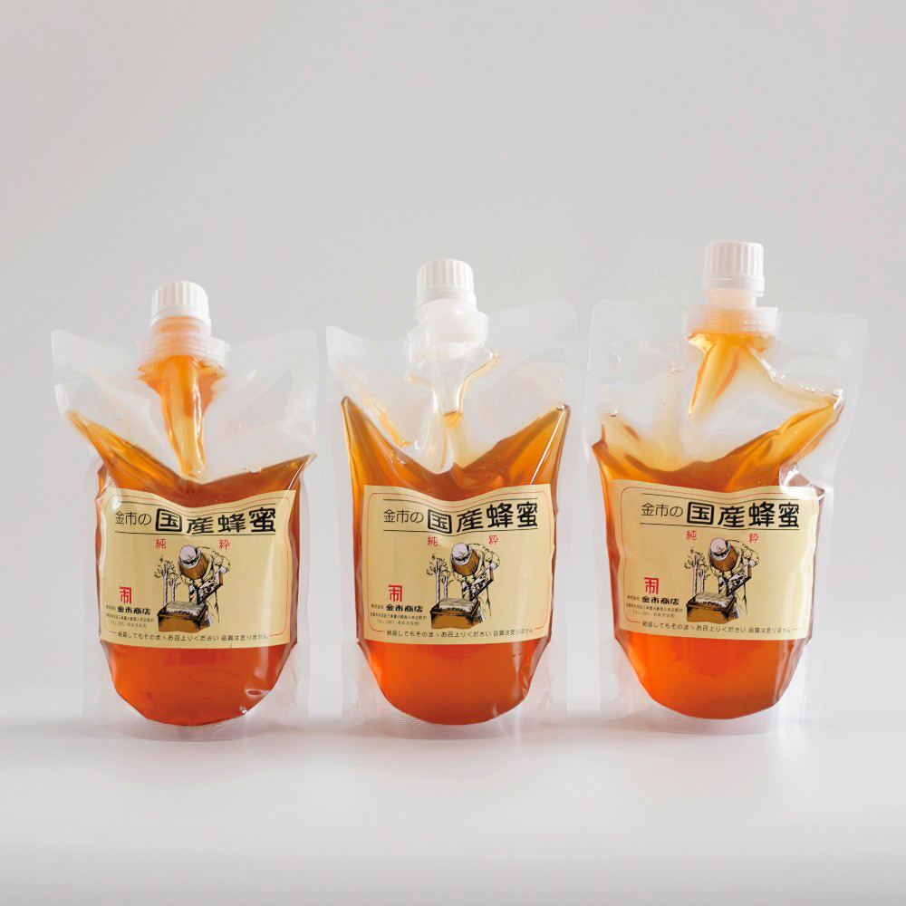 人気の袋入り国産蜂蜜を3点おまとめでお買得プライスでご用意いたしました。日本全国様々な花から採れた蜂蜜を、ハニーハンター市川拓三郎がオリジナルブレンドした金市の国産蜂蜜。パンやヨーグルト、お料理や温かいお飲みものにも幅広くご利用いただけます。