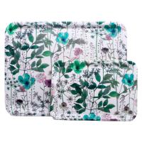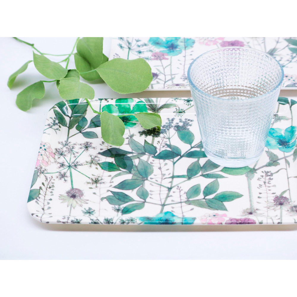 リバティプリントの生地に樹脂加工を施した華やかなトレー。サイズ違いの2枚がセットになった毎日使えるトレーです。
