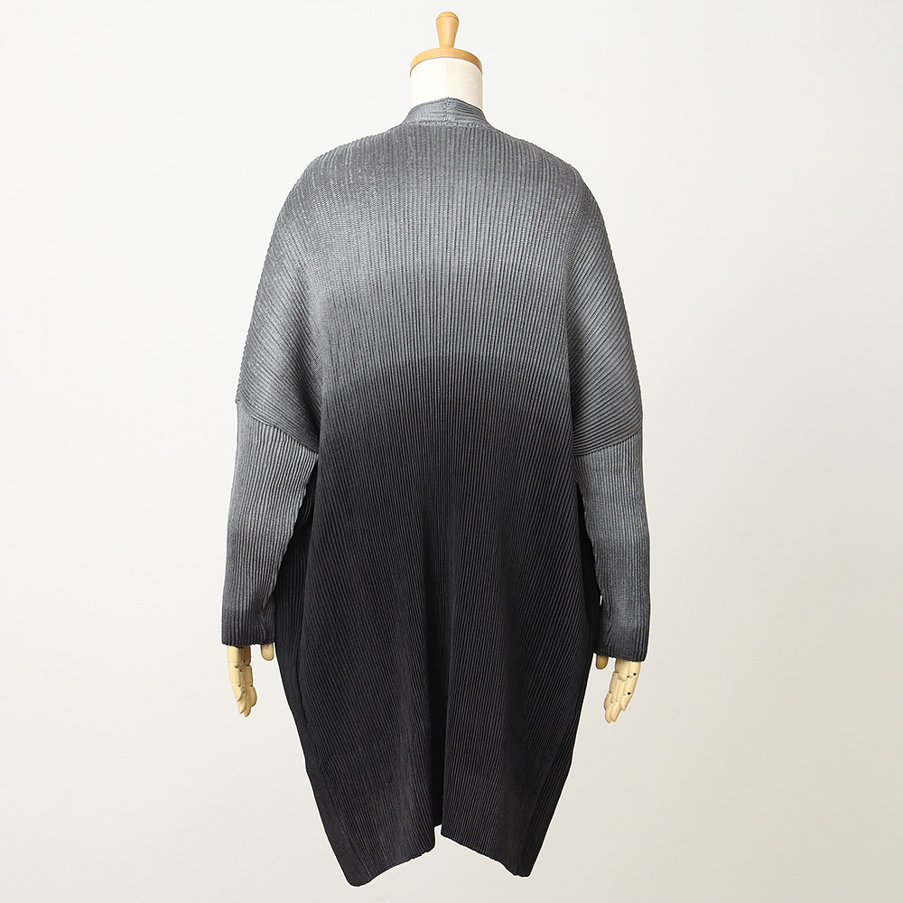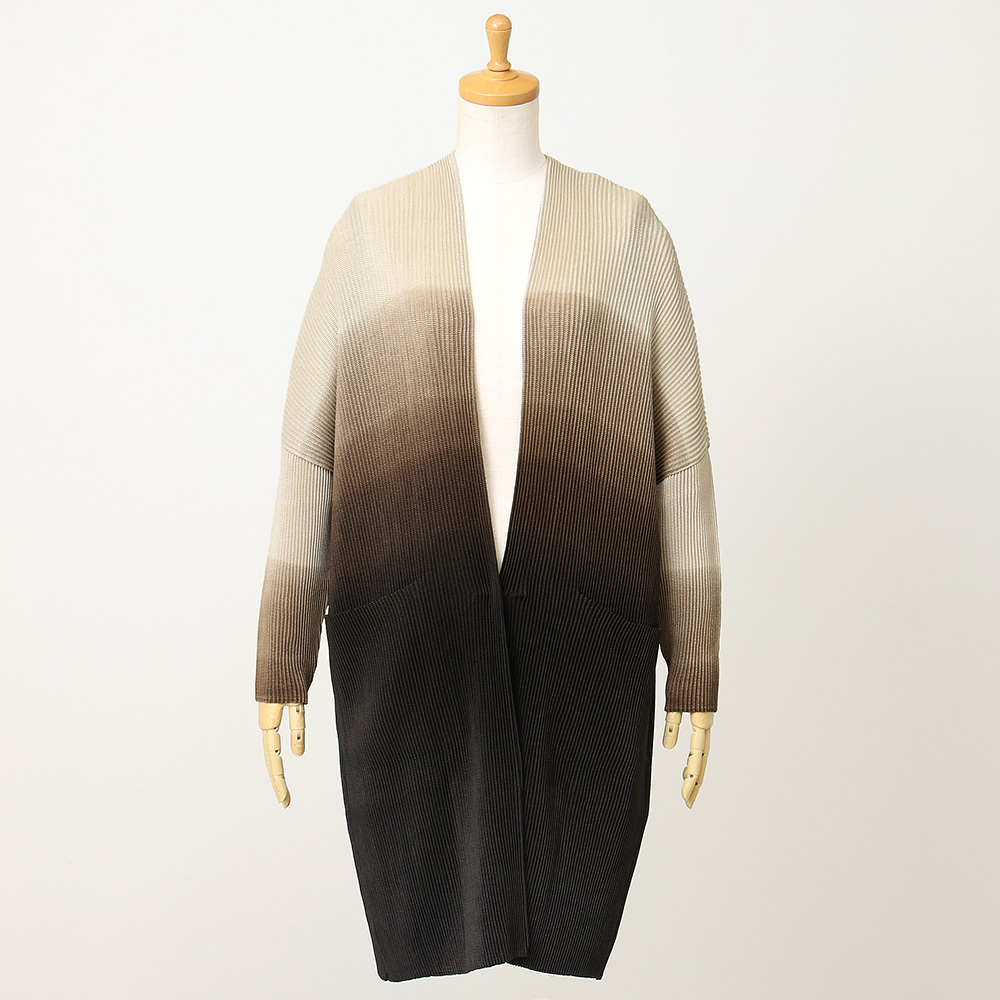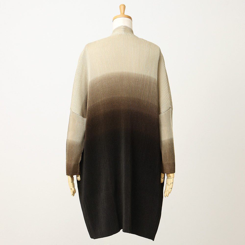 上品な婦人服に定評のある<スペッチオ>から、サイズフリー・ストレスフリーで人気のシャトルプリーツにモード感をプラスしたグラデーションカラーのロングカーディガンが登場。昨年のブラックフライデーでも好評のスペッチオ独自のプリーツ加工〈シャトルプリーツ〉で、どんな体形にもフィットするフリーサイズの洋服です。シルエットにこだわり、羽織っても細見えするラインで、サイズ問わずフィットします。コーディネートの主役になるグラデーションがシックなトーンで大人の表情に。スタイリッシュな装いを叶えてくれます。肩回りをゆったりと設計し、装飾性をそぎ落としたミニマルなデザインは、着心地の良さがありながら、洗練されたエレガンスな佇まい。ボディラインを拾わないゆったりシルエットと、縦長シルエットが華奢見えを叶えてくれます。縦横斜めと自在に伸縮するので、抜群の動作性があり着心地の良いアイテムです。お手入れも簡単で小さく丸めてもしわになりにくく、年末年始の家の中でのお集り、会食、フォーマルなクリスマスのパーティーなど、また旅行先の気温調節にとさまざまなシーンに対応し、冬だけでなく春秋と季節を問わずお召しいただけます。〈シャトルプリーツ〉とはできあがり寸法の2倍近い生地をプリーツ加工することで生まれるプリーツです。このプリーツ加工により、縦横斜め全方向の伸縮性とジャストフィット感が生まれます。着用の際に良く伸びますので、ウエスト、バスト、アームホールなどに締め付け感がなく、軽やかな着心地です。