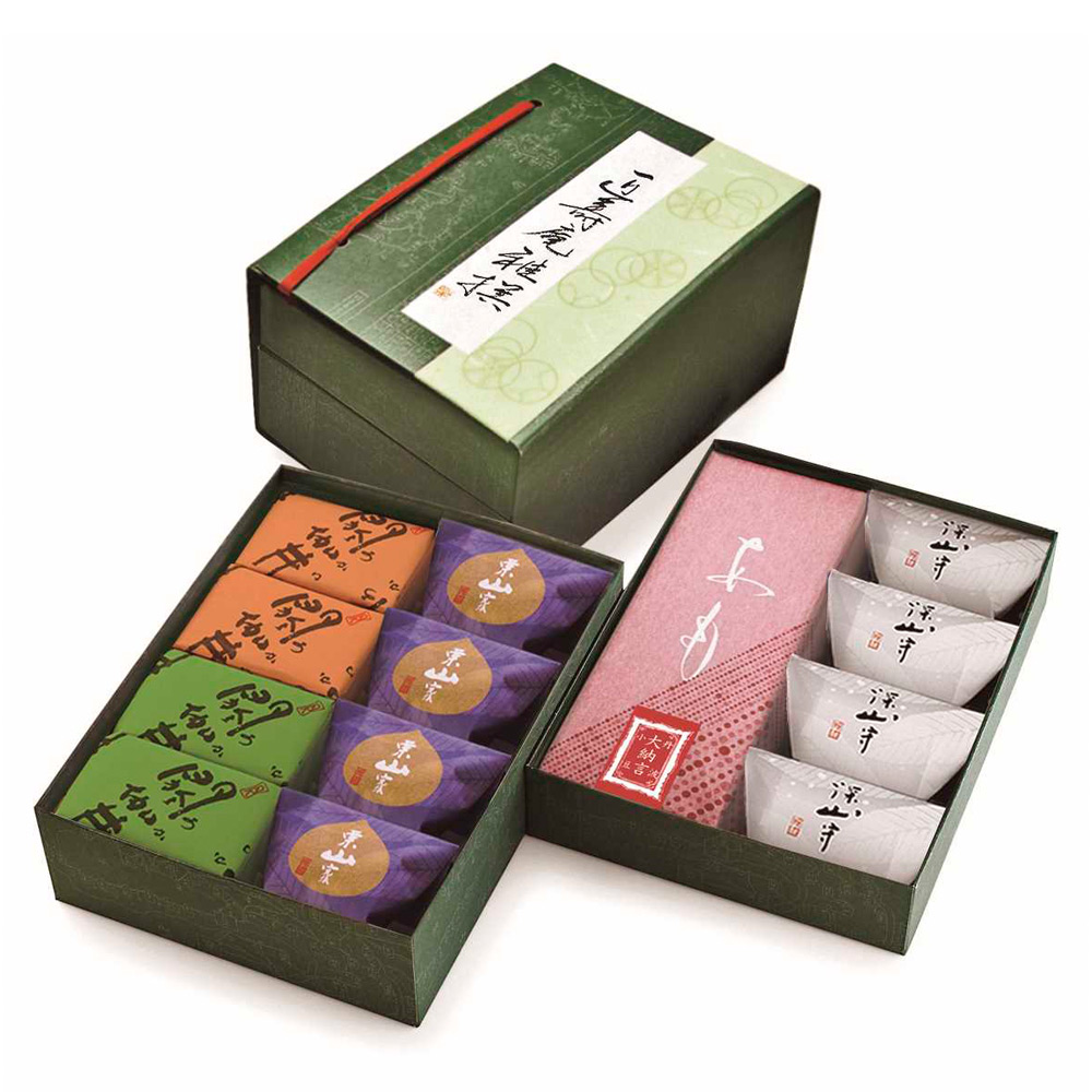代表銘菓「あも」をはじめに、定番銘菓から季節限定商品まで幅広くお詰合せしました。菓子の玉手箱のような姿は多くのお客様から現在も愛されています。