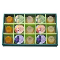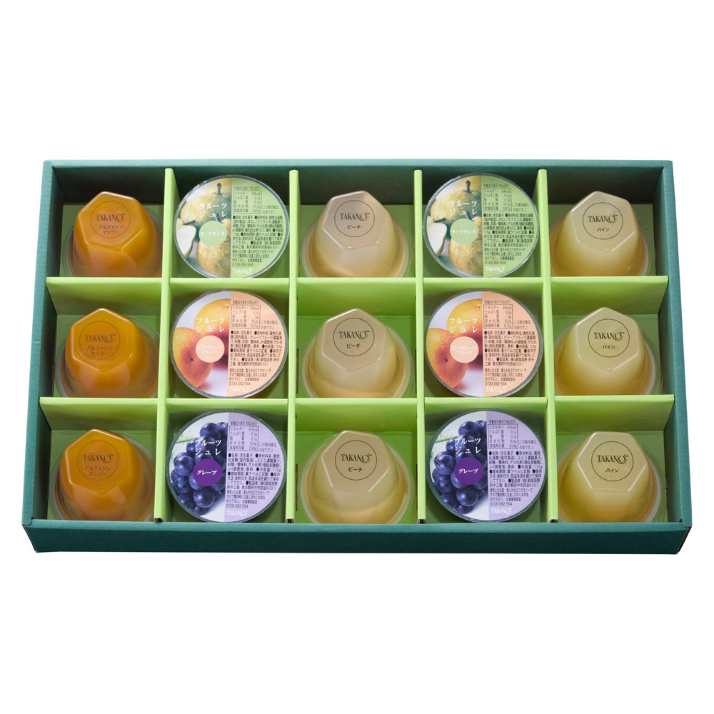 果実ゼリー(ピーチ、パイン、アルフォンソマンゴー×各3、フルーツジュレ(ピンクグレープフルーツ、グレープ、ラ・フランス×各2)
